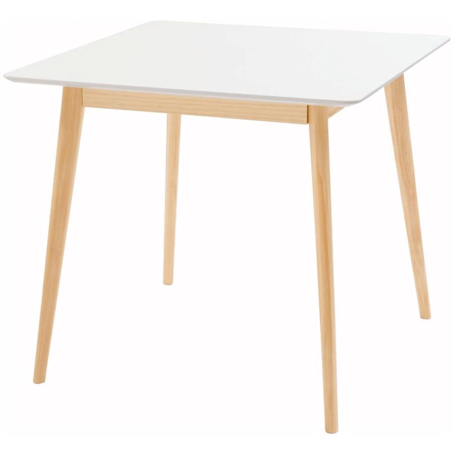 ●どんなインテリアにも合わせやすい、シンプルなスクエアテーブル。●省スペース向けのサイズながら、2人使いでもゆったりと食事ができる80角サイズ。●北欧風テイストの脚がハの字に広がるスッキリとしてデザインなので、どんな種類のチェアとも組み合わせやすいテーブル。●天板下の幕板は天板の反り止めや脚のグラつきを最大限抑え、テーブル全体に安定感を持たせてくれます。●ホワイト・ナチュラルどちらも、天板の表面は凹凸のない木目調仕上げ。●小口部分はデザイン性の高い船底形状。シャープですっきりとした印象なので、木製チェアからスチール素材を使ったチェアまで幅広く合わせられます。●脚裏にはフェルトが付いているので、床への傷防止にもなり安心です。