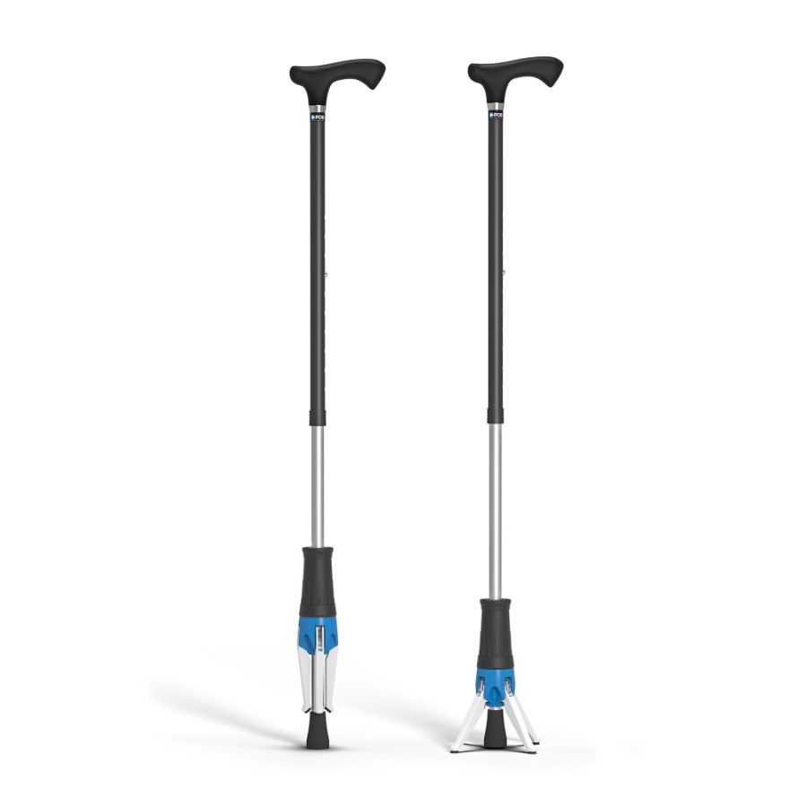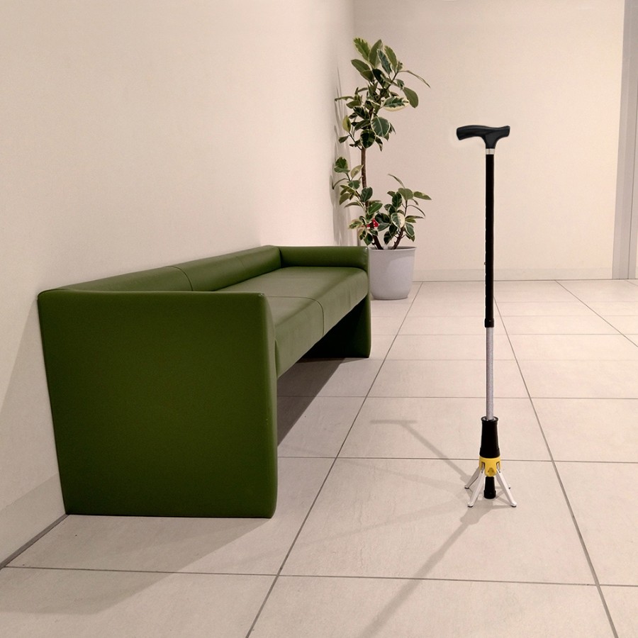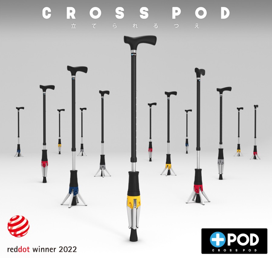 「クロスポッド」は”1点つえ”を、どこでも安定して立てられる様にした製品です。開閉式の脚を開くことで、杖を手放す場面、例えばトイレ、レジ、レストラン、待合室、ベッド脇等、置いておきたい時に、どこにでも立てられます。杖先部の脚開閉ユニットは小型、軽量で、開閉操作も簡単です。