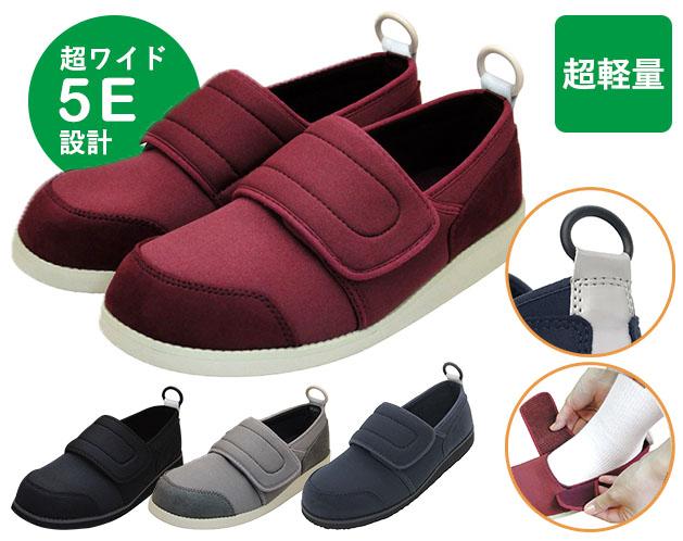 ★ゆったり感が大人気の超軽量シューズ!*お出かけがもっと楽しくなる機能満載のシューズ。*大きく開いて脱ぎ履きが楽々です。*つまずき防止のトゥスプリング。*衝撃吸収・屈曲性に優れたアウトソール。*履きやすい指リング付(反射材採用で、夜道も安心)*腫れやむくみでお困りの方。甲高・幅広の方に最適な5Eワイズ。*ワイズ:5E
