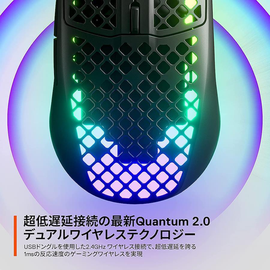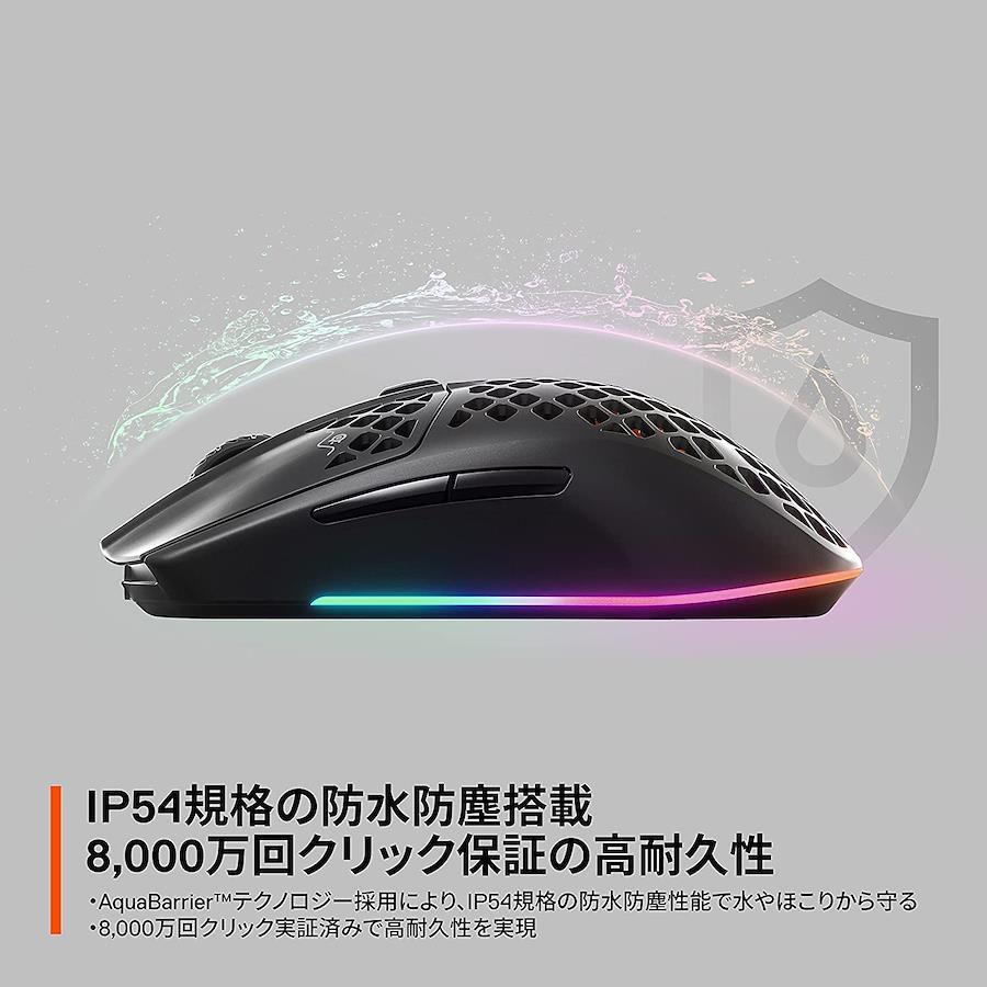 SteelseriesのゲーミングマウスAerox 3ワイヤレスは、楽にすばやくゲームプレイができる超軽量66gデザインの無線ゲーミングマウス。独特の穴が開いている外側のケースと、小型化されたエレクトロニクスは、極めて軽量になるように精密に設計されており、内部と外部のどのコンポーネントも、耐久性と快適さが最大になるように注意深く念入りに作られています。また、ミリ秒の差で勝負が決まるゲームは、スピードが命。Aerox 3 ワイヤレスは、ゲーミングで最速のスワイプが得られるように最適化されているため、競争相手の機先を制することができます。無線のゲーミングマウス用に最適化された200時間バッテリー寿命に加えて、USB-Cの急速充電。電力消費が特に最適化されるように工夫されたAerox 3 ワイヤレスバッテリーでは、パフォーマンスと軽さが犠牲にされることなく、最長200時間の連続使用が可能。15分間の急速充電で、40時間以上のゲームプレイが可能に。柔軟で軽量のUSB-Cメッシュケーブルにより、プレイしながら簡単に充電でき、着脱可能で、製品購入後にケーブルをカスタム化できます。Aerox 3 ワイヤレスはゲーミンググレードの2.4GHzと多目的Bluetooth 5.0によるデュアル接続。まったく新しいQuantum 2.0 Wirelessテクノロジーは、かつてないほど安定した信頼性の高い電力効率の良い方法かつ素晴らしいスピードで、ワイヤレスデータを送信。超低レイテンシーのゲーミンググレードの2.4GHzワイヤレスを使用することで、コードが不要でセキュリティ侵害もなく、完璧なフリックショットとケーブルからの解放感を味わうことができます。移動中も簡単にポケットに入れるだけで、ドングルは不要。Bluetoothを介してラップトップやその他のデバイスに簡単に接続できます。世界有数のセンサーメーカーと専用に共同開発されたピクセル単位の完璧なTrueMove Air光学ゲーミングセンサーを搭載した無線のゲーミングマウス。正確なワイヤレストラッキング専用に開発されているため、信じられないレベルの精度で正確に狙いを定めることが可能。PTFEグライドスケートは強化されたコントロールと滑らかさを発揮して、マウスが簡単にシルクのように滑らかに動くようにデザインされています。8,000万回クリックの耐久性(他のマウスの3倍の耐久性)を誇る、アップグレードされた防塵性と耐水性を備えたスイッチは、要求が厳しい状況でも完全なクリック感を味わいながらダブルクリックを防ぎ、しっかりした1つ上のレベルのショットを撃つことができます。 内部回路を実質的にあらゆるタイプの周囲環境からのダメージから保護するように設計されているAerox 3ワイヤレスは、IP54等級が認定された初めてのゲーミングマウスであり、耐水性に加えて、ほこりや汚れ、油、毛などから保護するAquaBarrier機能も搭載。右利き用形状は、クローまたはフィンガーチップグリップスタイルを使うときの軽さ、正確さ、そして快適さを求めるプレイヤーの最高の要求を満たすようにデザインされています。メーカー保証1年。