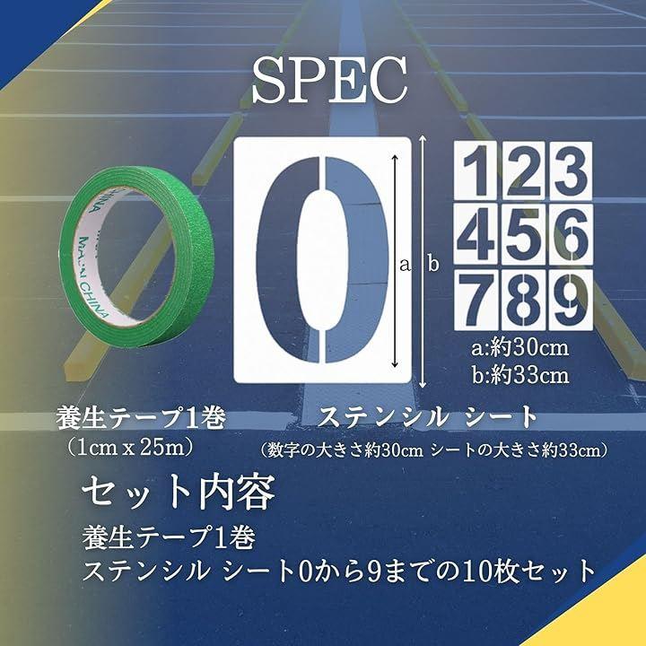 セット内容とサイズ:ステンシル シート0から9までの10枚セット(数字の大きさ約30cm シートの大きさ約33cm)・養生テープ1巻(1cmx25m)のセットです。
