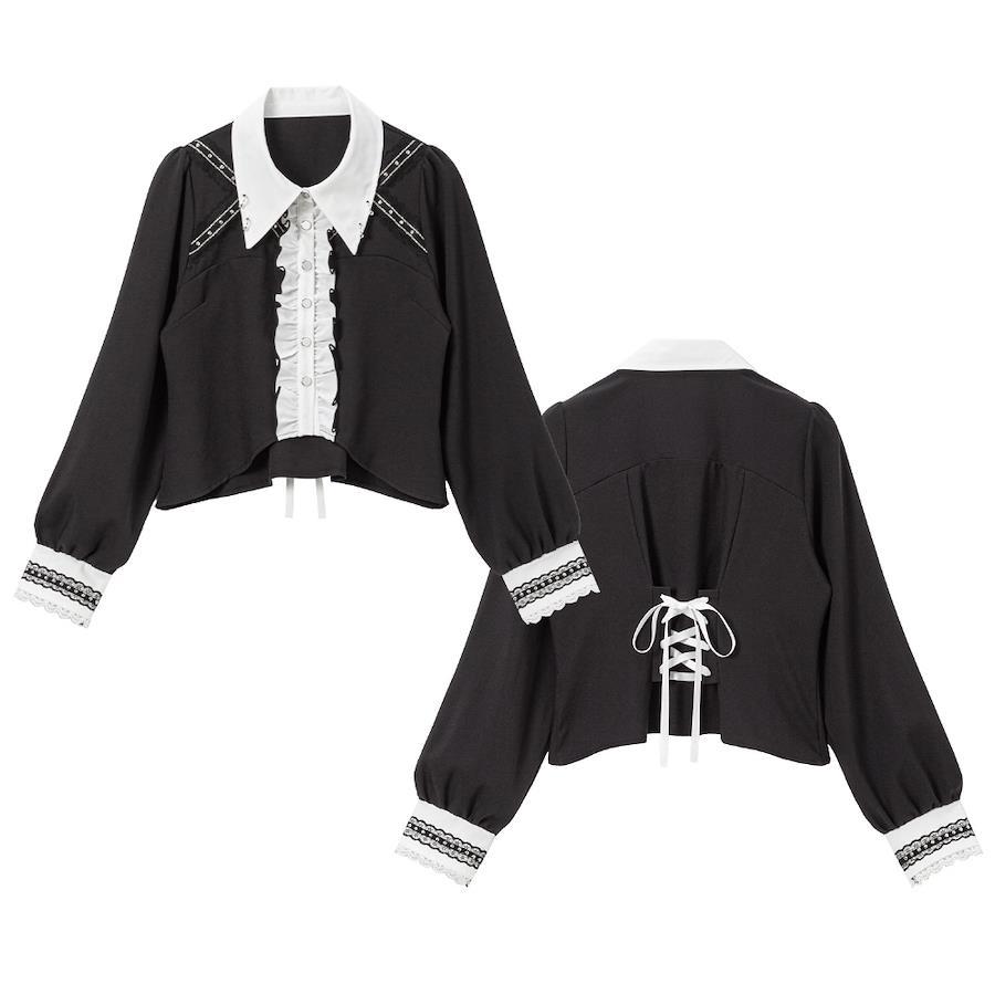 ゴシック風フリルレーススタッズテープブラウス【デザイン】角襟にピアス風のリングがデザインポイントになっていますヨーク部分レーススタッズテープがクロスになってるのがかわいい前立て部分フリルたっぷり上品ゴシック風にもなれます後ろのレースアップは調節可能で、ウエストをきれいに見せてくれます【素材】さらりとした肌触りで、少し張り感のある素材感です。ホワイトは濃色下着が透けることがありますので、インナーの着用をおすすめいたします。【コーディネート】地雷系サブカル系にピッタリのショート丈ブラウスになりますハイウエストスカート、スタッズレースブレードチェーンのスカートに合わせるのがオススメ