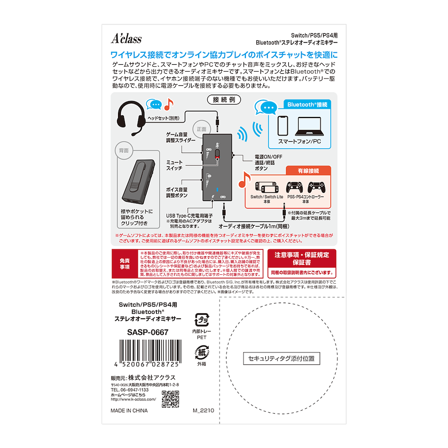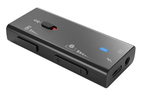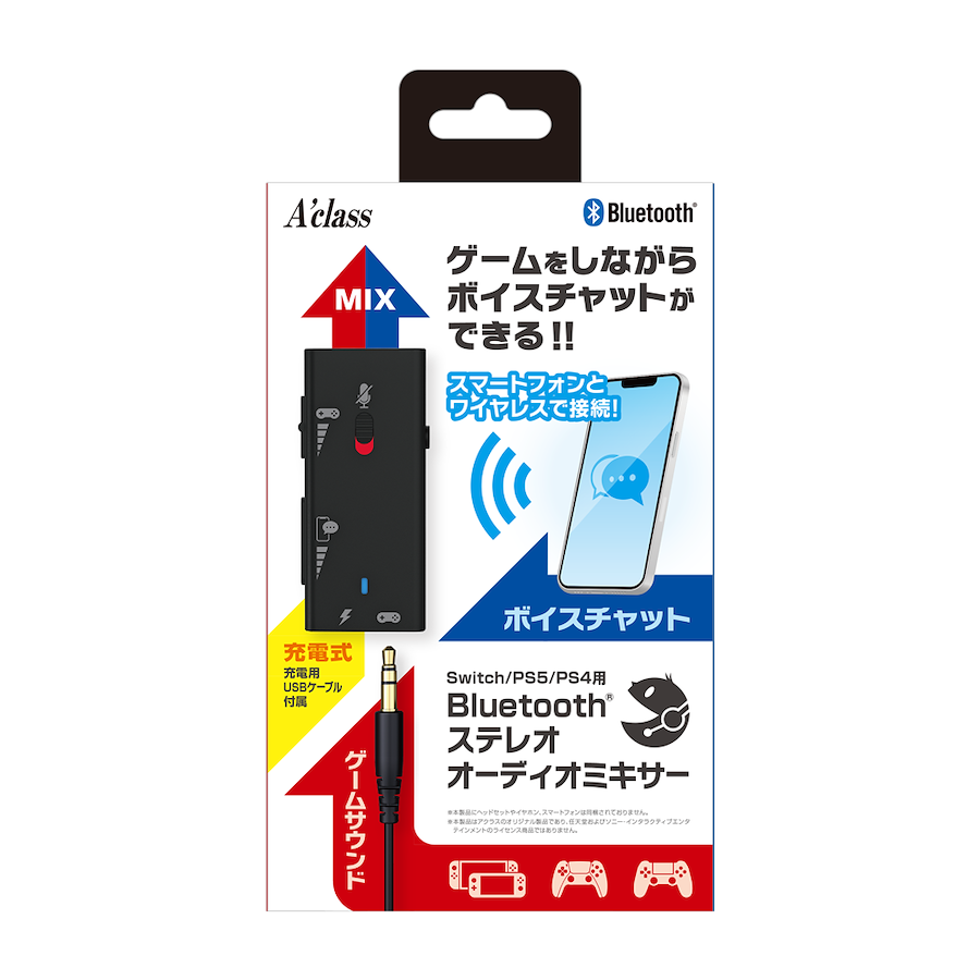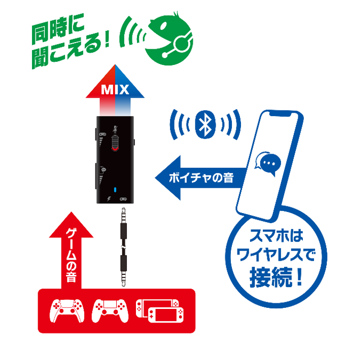 ●「ゲームサウンド」 と 「スマートフォンでの通話音声」をミックスし、お好きなヘッドセットやイヤホンから出力できるミキサーです。●スマートフォンとの接続はBluetooth通信で、イヤホン端子のない機種にもご使用いただけます。※ゲーム機器とは3.5mmステレオプラグで有線接続する必要がございます。●マイクミュートのON/OFFや音量調整といった操作を、ミキサー本体から行えます。●ゲームの音量と通話の音量は、個別に調整することができます。