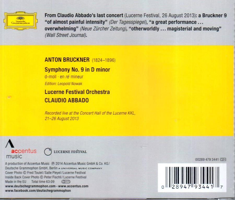 In January 2014, music lovers worldwide were saddened to learn that Claudio Abbado had passed away. This Bruckner's Symphony No. 9 in D minor was recorded as part of Abbado's final concert. A Wall Street Journal review called this performance 'magisterial and moving'. a fitting tribute to an irreplaceable artist, who was one of the greatest conductors and most inspiring musical figures of our time.