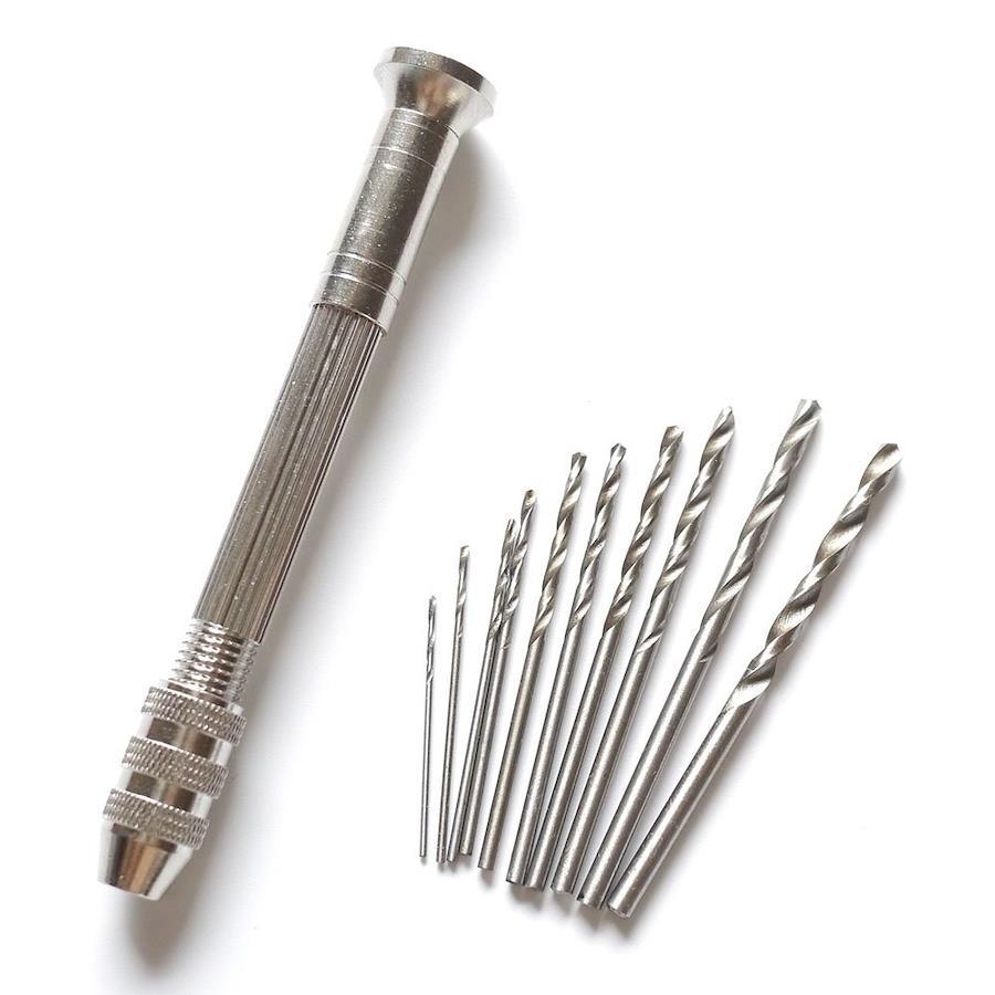 【ドリルの取り付け方】 十字スリット中心にドリルを挿入し、キャップを占める方向に回して取り付けます。 十字スリットが開きすぎると中心が合わせづらくなります。ご注意ください。 本体は、キャップ部分と中央部分がネジ状になっており、 外していただくと、 それぞれにコレクトチャックが入っております。 ドリルの抜き差しの際には、指などを切らないよう十分にご注意ください。 【使い方】 頭部を手の平に当てるようにし垂直に力を入れて回します。 頭部が回転することで、安定してご使用いただけます。 ※垂直に力を加えますと、作品をかけさせたり、ケガの元となります。ご注意ください。 ※破片などが飛ぶ場合がございます。 保護のため、メガネなどをご使用いただく事をお勧めします。 ※ 取扱い説明書などは付属しておりません。 付け替え可能なピンバイス レジン穴あけ用 ドリルセット です。(レジン(透明樹脂)で作った作品に穴をあけたり、基盤製作やプラモデル、ビーズ細工などのクラフト作業などでも使えます。) 2個のチャックを本体に収納: 2個の両頭チャックを本体に収納しており、使用する先端に応じてチャックを付け替えることができます。 ドリル刃のサイズ:0.8mm、1mm、1.2mm、1.5mm、1.8mm、2mm、2.2mm、2.5mm、2.8mm、3mm。 素材:鋼(金属や石のようなハードなものにはご使用しないでください。) 使い方: 頭部を手の平に当てるようにし垂直に力を入れて回します。 頭部が回転することで、安定してご使用いただけます。 セット内容:収納式ピンバイス×1本、ドリル×10本(ケース付き)