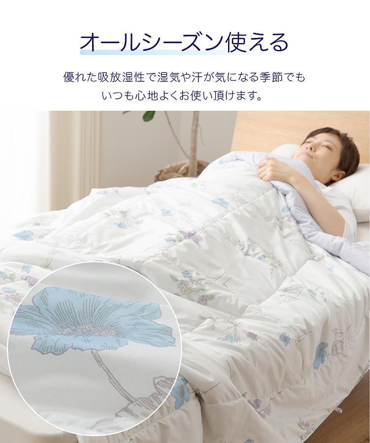 ★まるで呼吸するように優れた吸放湿性を発揮する、肌掛け布団!*中綿にポリエステルの長繊維とレーヨンを絡ませた特殊中綿を使用することで、シルクのようななめらかな肌触りと、さらさら感のある布団に仕上がりました。*中綿は、真綿布団のように1点ずつ手引きで形を整えています。*肌面にもこだわり、しっとりと風合いのいいレーヨン混の生地を使用しています。絶妙な「なめらかさ&さらさら感」がお肌に気持ちいい布団に仕上がりました。*表地に高密度生地を使用し、中綿に長繊維を採用することで、ホコリの出にくい布団になりました。羽毛の肌掛け布団と比べても、1%以下のホコリ量です。*洗濯機:可(ネット使用)