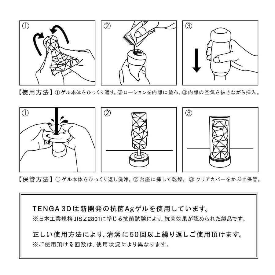 快感のオブジェ。 HOLEにおける内部形状は「刺激を与える」という目的しか持ちえなかった。 しかし、「ひっくり返して→洗って→乾かす」というプロセスを考えたとき、内部形状はむしろ「外観」となる。 この視点をもった瞬間、快感を生み出すディテールと造形美の融合は、オナニーの極致を目指す者にとっての理想となる。 TENGA 3D。それは、発想の転換が生んだ「快感のオブジェ」だ。 エッジとねじれによる快感のコンポジション。 六角形のプレートをねじりながら積み上げて構築した立体。一段一段の細かいエッジが生み出すプリプリとした細かい刺激と全体のねじれが生み出すダイナミックな刺激を味わうことが出来る。2つの刺激によって構成された快感は、ソフト派ハード派共に楽しめる仕上がりとなっている。 商品サイズ (幅×奥行×高さ) :4.8x4.8x11.6(cm) 重量:133g 収納ケース、付属ローション入り 種類: 単品