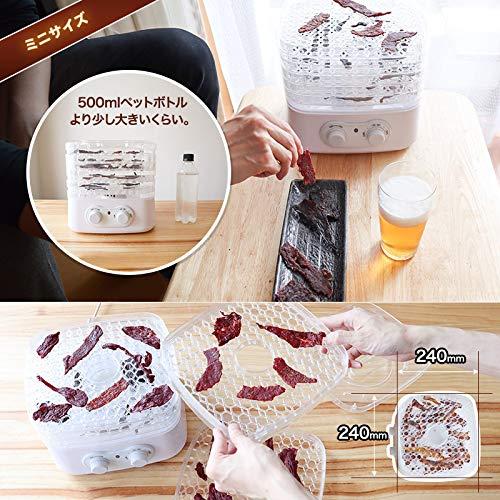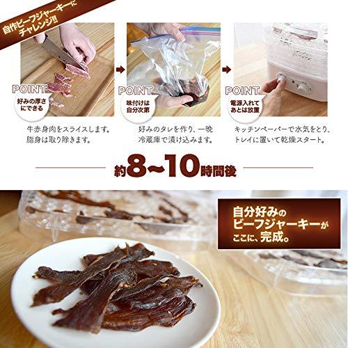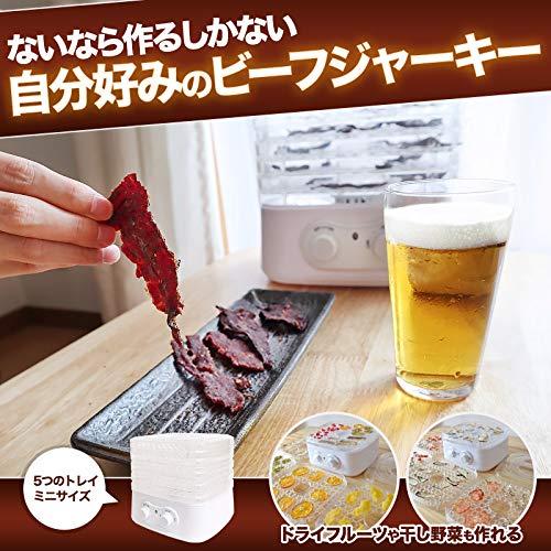 3営業日以内に発送≪新品未開封品≫:自分好みの自家製ビーフジャーキーが、簡単に作れるドライフードメーカーです。肉の味付けも大きさも自分次第。お肉を切って、味つけ、温風乾燥、これだけ。 ビールの最高のおつまみが自作できます。また、愛犬用に無添加のササミジャーキーや、 ビーフジャーキー以外にも、低温乾燥で栄養価を壊すことなく、ギュっと旨味が凝縮されたドライフルーツや干し野菜が作れます。5段トレイ、30℃~70℃(※1)の温度設定、タイマーなし。 卓上に置いても邪魔にならないミニサイズで、使いやすさ二重丸。 ※1:ヒータ部の温度
