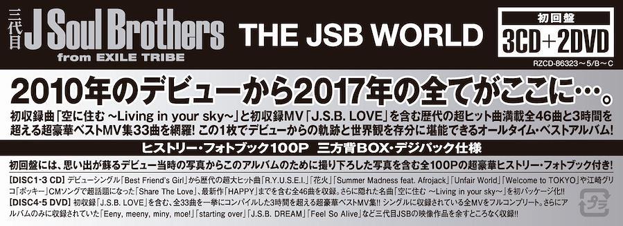 2010年のデビューから2017年の全てがここに!この1枚でデビューからの軌跡と世界観を存分に堪能できるオールタイム・ベストアルバム!初収録曲「空に住む ~Living in your sky~」と初収録MV「J.S.B. LOVE」を含む歴代の超ヒット曲満載全46曲と3時間を超える超豪華ベストMV集33曲を網羅!この1枚でデビューからの軌跡と世界観を存分に堪能できるオールタイム・ベストアルバム!○WOLRD 1:2010年のデビューから現在まで、彼らの軌跡を辿る全46曲を収録!デビューシングル「Best Friend's Girl」に始まり、ランニングマンでお茶の間人気を博した日本レコード大賞初受賞曲「R.Y.U.S.E.I.」はもちろんのこと、NHK紅白歌合戦初出場を果たしたバラード曲「花火」、大ヒット映画の主題歌として起用された「Unfair World」、初のオリコン首位を獲得した「FIGHTERS」やドラマ主題歌として起用された「SO RIGHT」、江崎グリコ「ポッキー」CMソングで話題となった「Share The Love」や「Summer Madness feat. Afrojack」「Welcome to TOKYO」最新作「HAPPY」まで、改めて知る三代目 J Soul Brothersの魅力が詰まった歴代の超大ヒット曲全46曲を一挙収録!