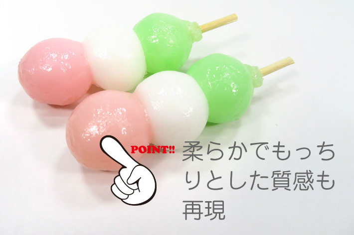 淡いカラーがカワイらしい三色団子のアクセサリーです。長さ約7.5cmのミニチュアサイスです。もちもちした表面の質感や、自分の重みで少し潰れた裏側など、細部にまでこだわってます。