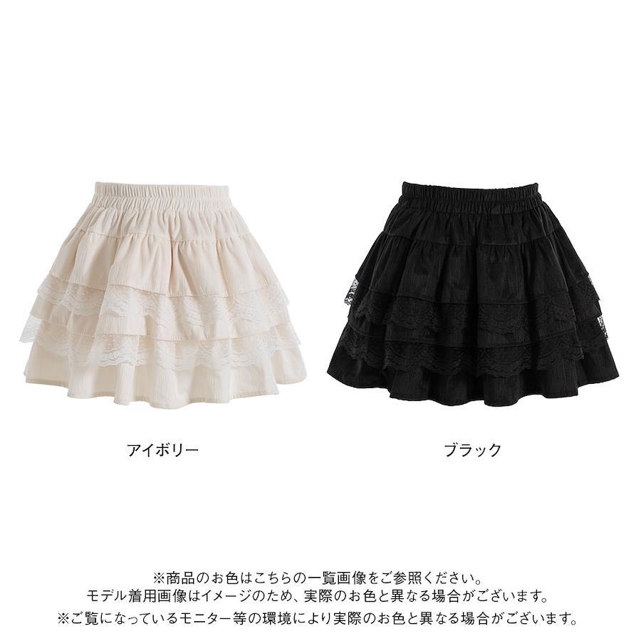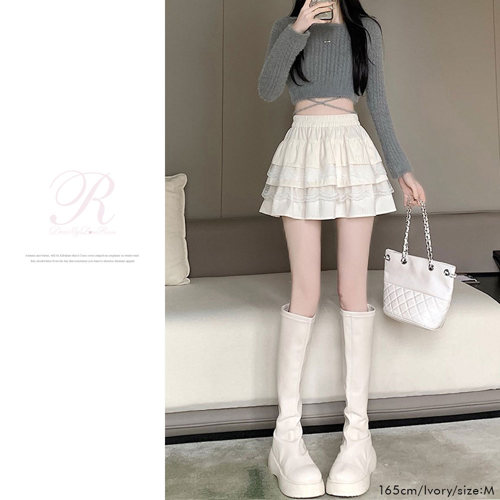 ティアードレースコーデュロイミニスカのご紹介。【デザイン】バレエコアなスタイリングにぴったり♪ふりふりデザインが可愛いミニスカパンです。ウエストは総ゴムになっており、履き心地も楽ちん♪裏地はパンツタイプになっているので、ミニ丈ですが安心して着用いただけます。