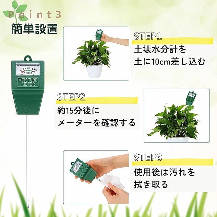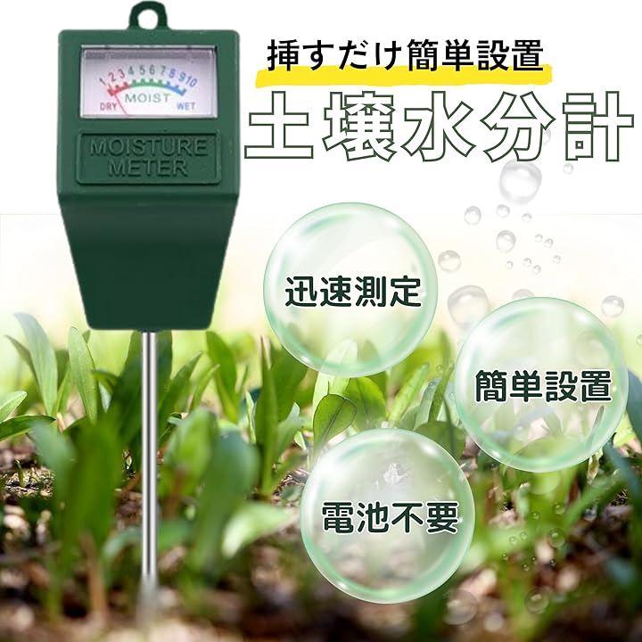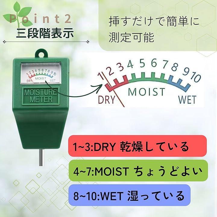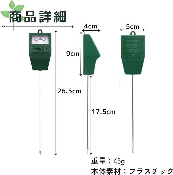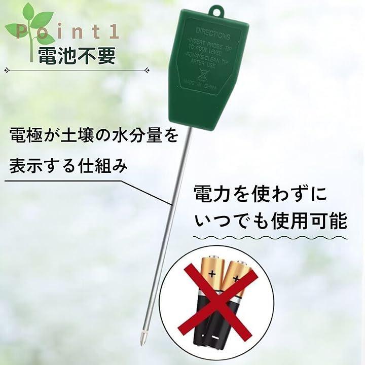 「特徴・特長」 この水分計は電池不要で、土に差し込むだけで即座に水分量が表示されます。