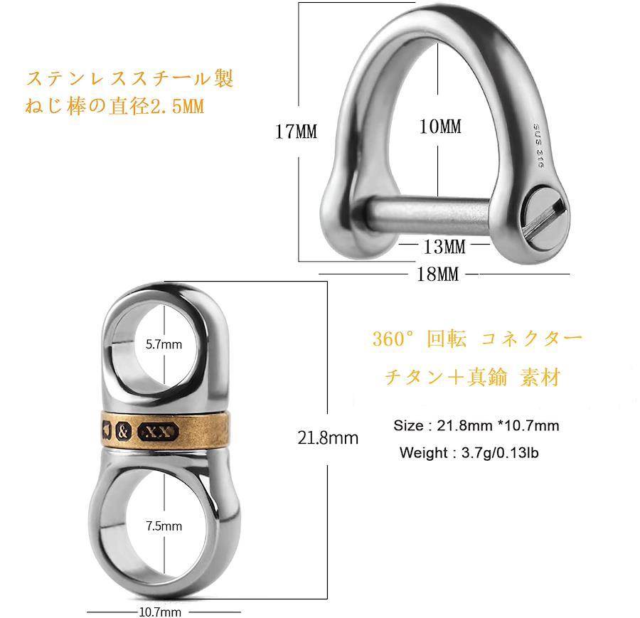 スマートキーやチェーンの連結などにお使いいただけます。【チタン製、一体成形】チタン製:チタンは、軽く、強く、海水にさらしても錆びない金属です。また、磁気を帯びる心配やアレルギーの心配が少ない素材です。これらの特性からゴルフヘッドや自動車部品、アウトドア食器、さらには歯科用インプラント材料としても注目されています。[ホビーDIY用の金具]クラスプ、ネックレス、ジュエリー、タグ、DIY工芸品、キーホルダー、チェーンなどの小さな部品の連結などにお使いいただけます。[車のキーホルダーとして]軽くて強い、錆びないし磁気も帯びないチタンから作り出すキーリングは素材の高級感と、職人の丁寧な手磨きから作り出すしっかりした構造を兼ね備えております。毎日持ち歩く車のキーホルダーとして、軽量で持ち運びしやすいだけでなく、高級感もたっぷりです。[サイズ&重さ]360°回転コネクタ:長さ22mm*直径約8mm/重さ約4g Dリング:横外寸18㎜*縦外寸17㎜ 横内寸13㎜*縦内寸10㎜ ボルト径2.5㎜ 重さ:3g/個パッケージ内容:チタン360°回転コネクタ*1個+ステンレスDリング*1個+専用ドライバー*1個 保証期間:ご購入日より一年間の商品保障を提供いたします。商品の発送には十分注意をしておりますが、万一ご注文と異なる商品や、商品に問題があった場合は、お手数ではございますが当店までご連絡下さい。
