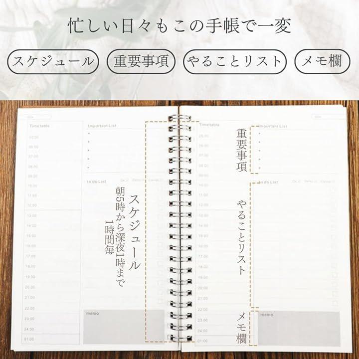 朝5時から深夜1時まで、1時間毎のスケジュール管理に加え、重要事項リスト、ToDoリスト、自由メモ欄も完備。