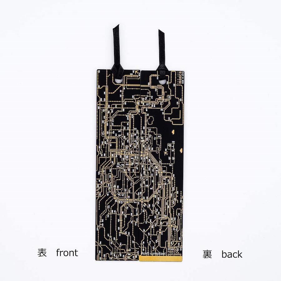 東京回路線図 基板アート栞は、工業用プリント基板で製造しました。本来の基板と同じ材料、工程、製造方法で製造している栞です。本や手帳、そして手を傷つけないよう基板の端面より0.15mmの銅箔を削除しています。0.3mm厚の基材を使用していますが、金メッキや両面のレジストインクとシルク文字を合わせると、仕上がり総厚は0.45mmになります。──────────デザインソフトではない基板専用CADを使い、マウスで一本一本線を引き作画しています。細い線では0.1mmの配線パターンで緻密にデザインされています。──────────西エリアは「大船駅」、東エリアは「成田空港駅」まで網羅。成田空港(NRT)と羽田空港(HND)には飛行機マーク、東京湾には船マークを入れています。鉄道駅の名称はシルク3文字で表現しています。(例:TKY=東京)──────────緑・黒・白・ピンク色は、回路パターンを保護する絶縁膜となるインク(レジストインク)の色です。ちなみに、緑色のレジストインクは日本で一番使用されています。日本で設計、製造しており、全ての商品はRoHS対応品(鉛不使用商品)です。基板は金メッキ処理をしています。──────────【ご注意】・電子部品は実装されていません。・緑色のレジストインクは透過性があるため裏側が少し見えます。・栞は透明袋に包装します。(ギフトボックス梱包ではありません)・受注順に出荷させていただきます。──────────■製品仕様東京回路線図 基板アート 栞価格 :3,000円(税込)カラー :緑・黒・白・ピンクサイズ :140mm×32mm×0.45mm重さ :3g使用電子部品:無し