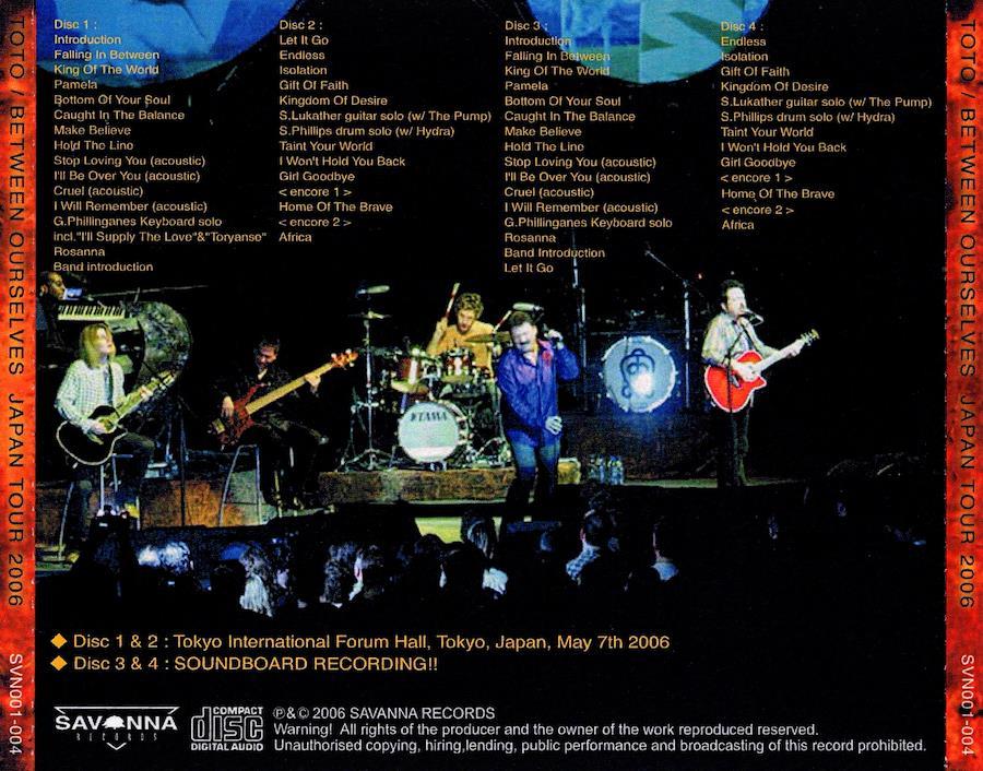 新作(Falling Between)を引っさげて2006年5月7日東京国際フォーラムで行われたLIVEを超高音質オーディエンス収録にて登場です。新曲から定番曲まで原曲を損なうことないアレンジでToToの素晴らしさを再認識できるタイトルです。DISC3&4は場所不明ながら2006年最新ライブをサウンドボード収録!