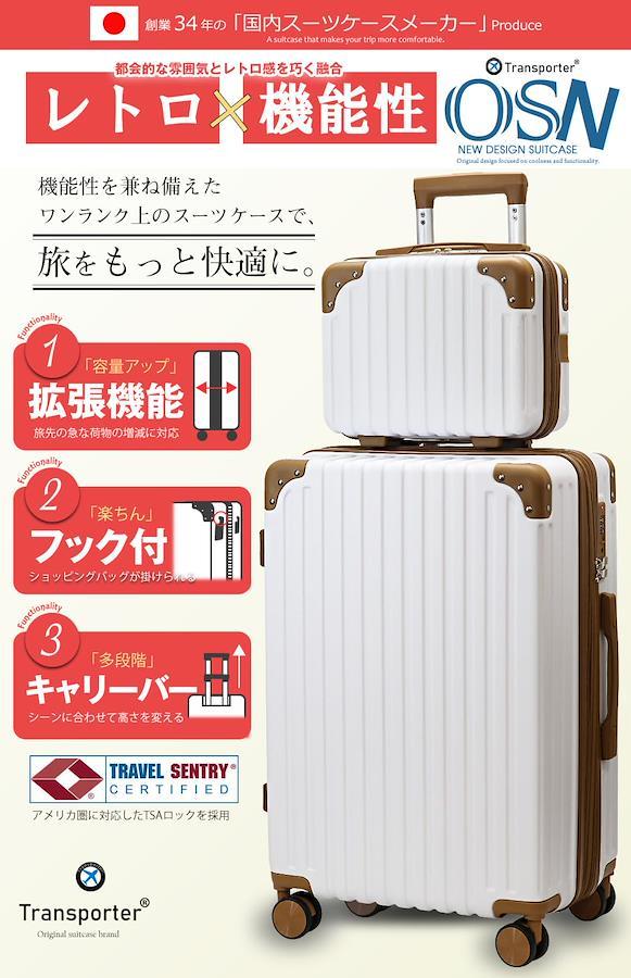 全体サイズ:【スーツケース 機内持ち込み Sサイズ】約横幅38.5×高さ56×奥行24cm(拡張後+約5cm) 、【スーツケース Mサイズ】約横幅45×高さ66×奥行28.5cm(拡張後+約5cm)、【スーツケース Lサイズ】約横幅51×高さ75.5×奥行32cm(拡張後+約5cm) ※全体サイズは車輪や持ち手など全て含めた値です。 ケースサイズ:【Sサイズ】約横幅35×高さ49.5×奥行24cm(拡張後+約5cm) 、【Mサイズ】約横幅42.5×高さ59.5×奥行28.5cm(拡張後+約5cm)、【Lサイズ】約横幅47.5×高さ69.5×奥行32cm(拡張後+約5cm) 重量:【Sサイズ】約2.65kg、【Mサイズ】約3.35kg、【Lサイズ】約4.1kg、【トランク】約850g キャリーバー 多段階調節可能:【Sサイズ】最長約100cm、二段目約77.5cm、【Mサイズ】最長約100.5cm、二段目約88.5cm、三段目約73.5cm、【Lサイズ】最長約112cm、二段目約93.5cm スーツケース素材:ABS エンボス加工、傷つきにくい。 鍵:アメリカ圏内での空港に預ける際に鍵をかけたままキャリーケースを預けることができる世界基準のTSAロックを搭載。開錠は、ダイヤルロックなので鍵をなくす心配もありません。※鍵は航空会社検査専用のため本製品には付属しておりません。