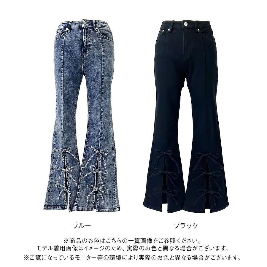 シンプルながら、3つリボンがガーリーさをプラスしてくれるフレアパンツ。