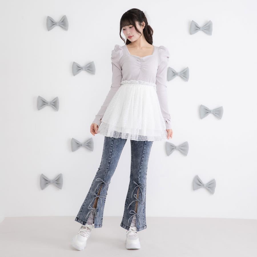 シンプルながら、3つリボンがガーリーさをプラスしてくれるフレアパンツ。