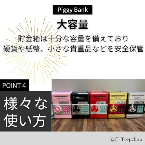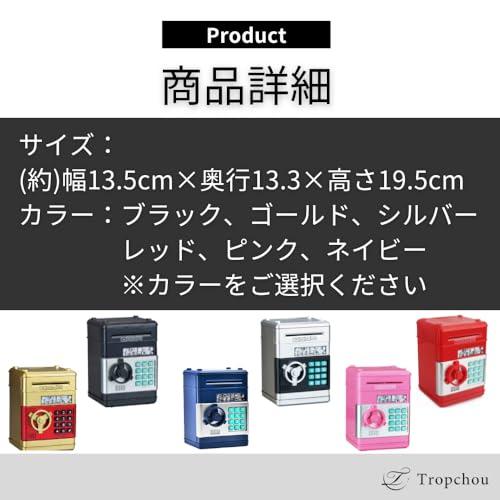 【ダイヤルロック式の貯金箱】 4桁のパスワードを入力して解錠する安心セキュリティのダイヤルロック式貯金箱です。紙幣と硬貨の両方を貯金できます。4桁のパスワードはお好きなナンバーを設定でき、誤ったパスワードを入れた場合には赤色に点灯しお知らせます。パスワードが正しければ青色に点灯し音楽が流れロックが解除されます。貯金箱の他にも大切な小物の保管にも便利です。 【音が流れる紙幣自動吸い込み式】 紙幣投入口で紙幣を検出すると自動販売機のように自動的に吸い込みます。紙幣を吸い込むと音が流れるので、楽しみながら貯金ができます。 【お子様の貯金にもピッタリ】 楽しみながら貯金ができセキュリティも安心なので、お子さま用の貯金箱にぴったり。お小遣いの管理や、金銭教育、節約の意識付けにも便利です。誕生日やクリスマスなどのプレゼントにもおススメです。大人も子供も楽しくお金を貯めることができる貯金箱です。 【商品仕様】 サイズ:(約)幅13.5cm×奥行13.3×高さ19.5cm カラー:ブラック、ゴールド、シルバー、レッド、ピンク、ネイビー(※カラーをご選択ください。) 電池:単3電池3本使用(※電池は付属しておりません) <パスワードの変更方法>1.工場出荷時のパスワードは「0000」です。2.扉を開けた状態で「*」を押すとライトが点灯します。3.15秒以内に新しい4桁のパスワードを押して最後に「#」を押すとパスワードが変更されます。4.パスワードを忘れてしまった際、電池を外して再起動いただくことで工場出荷時の「0000」に戻ります。 【30日間の返品・返金保証】 ご購入より30日間返品・返金保証がございます。万が一商品にご満足いただけない場合、商品に初期不良などがある場合は迅速にご対応させていただきます。安心してお買い求めください。