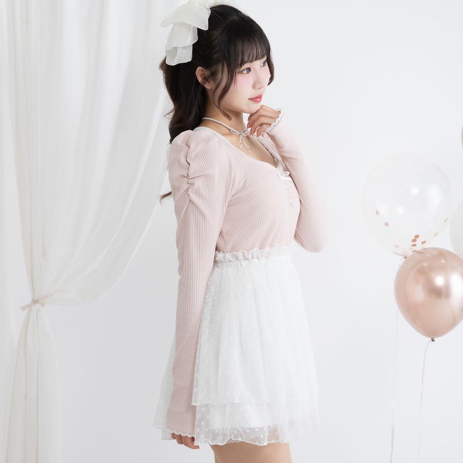 上半身は襟ぐりや袖口のレース、リボンが可愛らしく、パワショルでプリンセスみのあるガーリーなデザイン◎