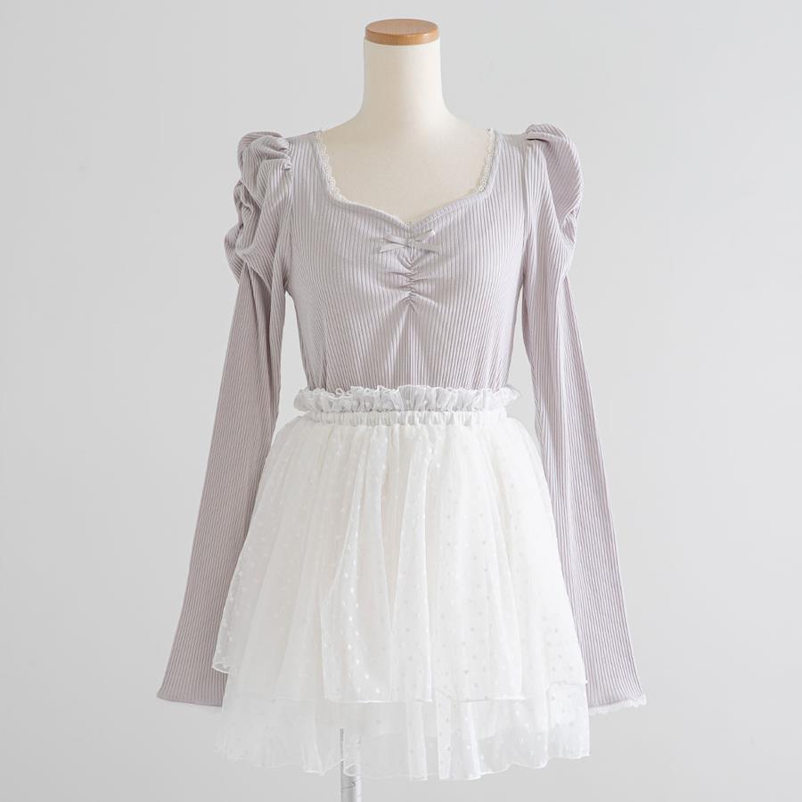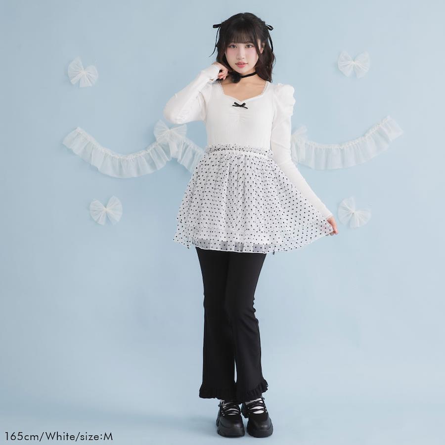 上半身は襟ぐりや袖口のレース、リボンが可愛らしく、パワショルでプリンセスみのあるガーリーなデザイン◎