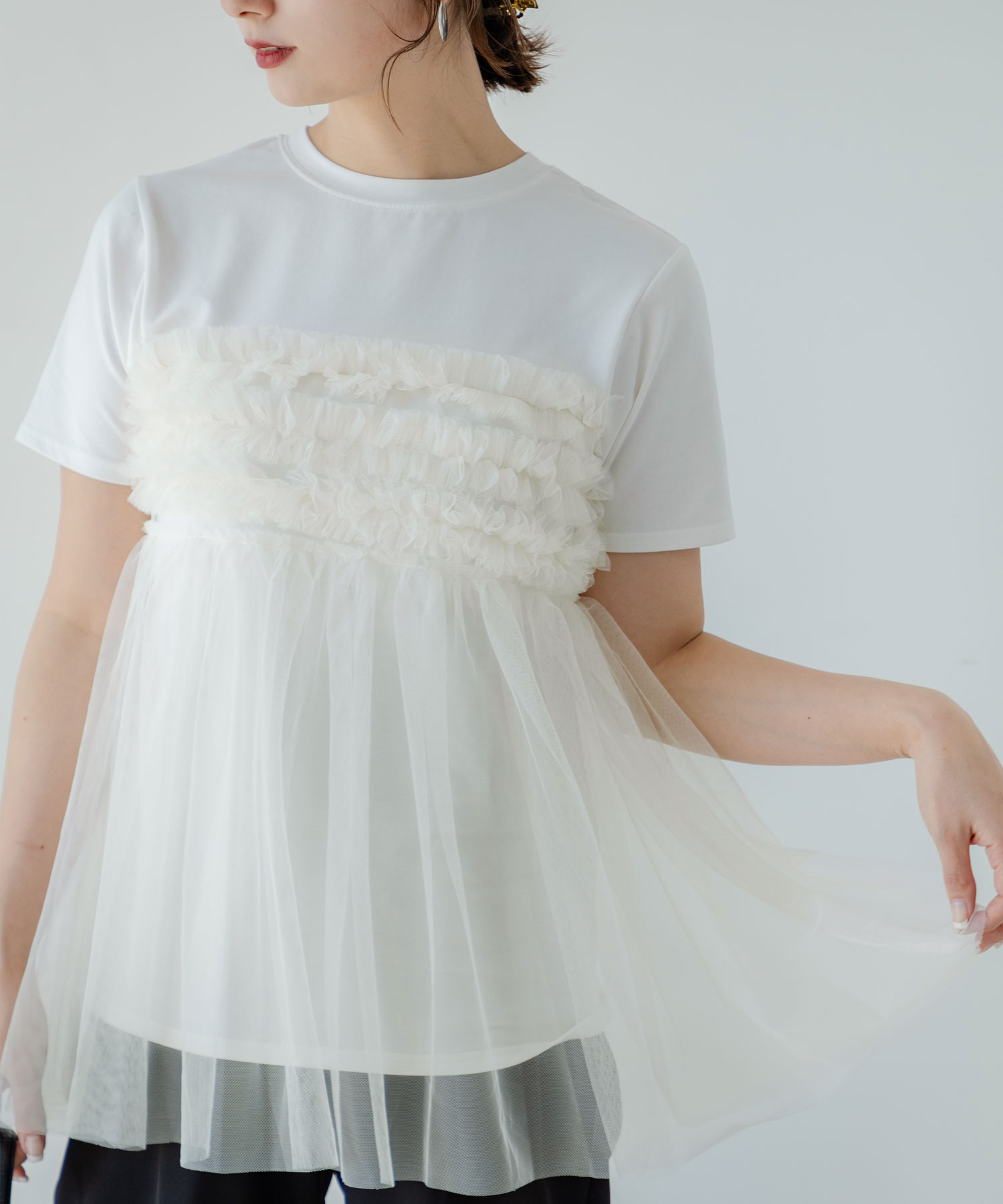 ギャザーフリルのボリューム感とレイヤードされた1枚チュールのバランスが絶妙。