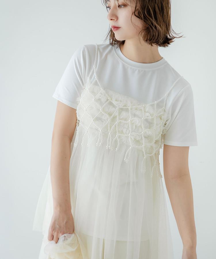 柔らかく目の細かいチュールを使っているので肌触りがよく、繊細かつエアリーな雰囲気をまとった1枚。