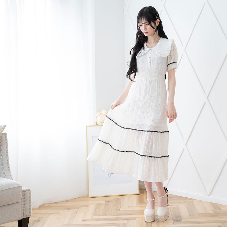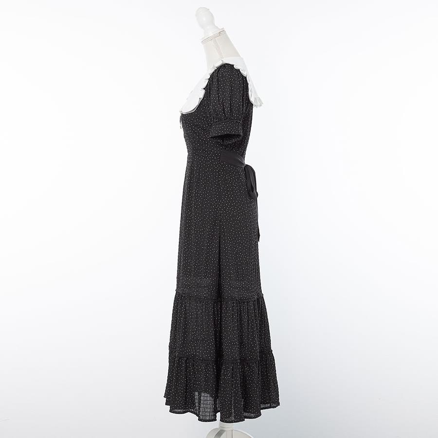 柔らかな風合いと肌馴染みの良い素材で仕立てているので、ロング丈でも軽やかな印象に。体型を拾いにくいフレアシルエットで着心地にも優れたデザインです。全面に施されたドット柄は主張しすぎない配色となっているのでどんなシチュエーションでも着やすく、ウエスト部分のバックリボンでフェミニンさもプラスしてくれるのが特徴です。