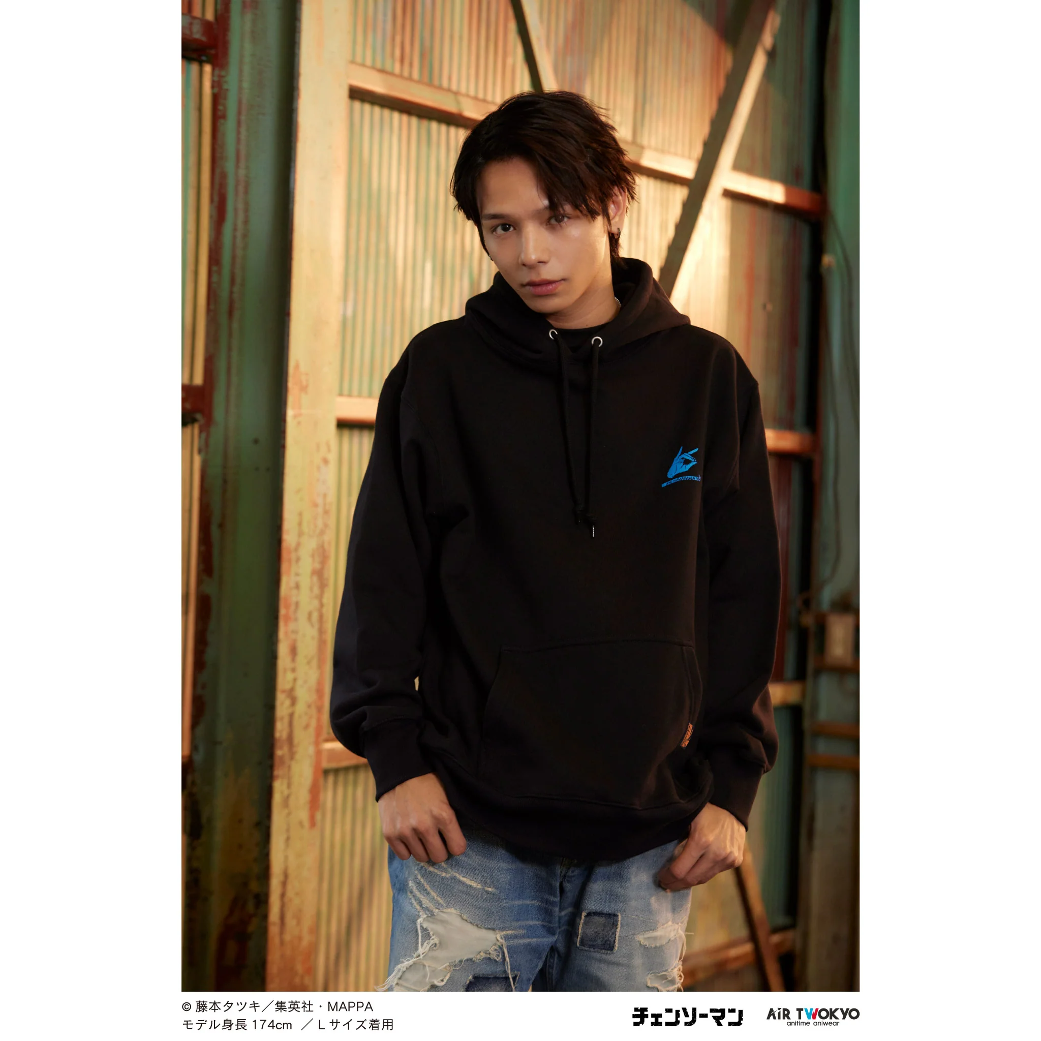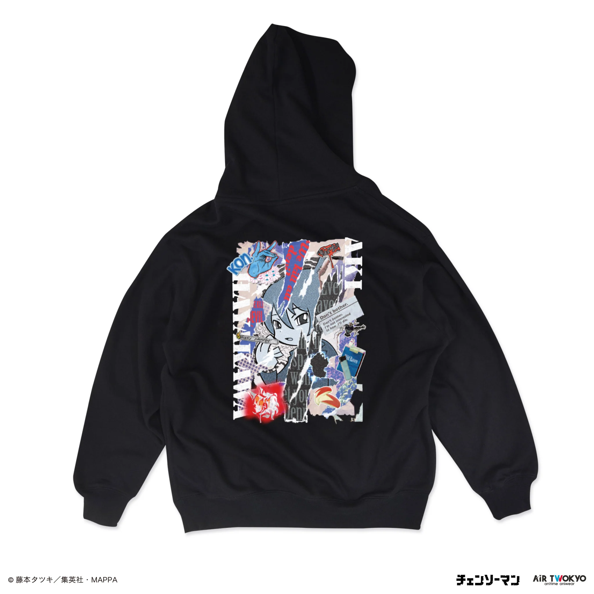 早川アキをモチーフとしたアイコン、印象的なシーン、台詞を組み合わせたシーンデザインパーカー。ストリートアートからインスパイアしたデザインであり、デシーンデザイン表現(グラフィックを切り貼りする手法)を用いている。デンジに切ったリンゴや未来の悪魔等、早川アキに関連するアイコンが散りばめられた1枚。フードの形状がきれいで立体的な大きめサイズ。ざっくりとしたサイジングが特長のヘヴィーパイル。