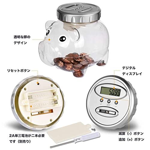 大容量貯金:500円玉600枚で30万円貯められる貯金箱。 デジタルカウン:投入したお金の合計金額を自動で計算。7桁まで表示します。 全硬貨対応:1円玉?500円玉まで全ての硬貨を識別できます。 ※日本の硬貨のみ対応。 貯金を実感:中が見えるのでどれだけ貯まったか視覚的にも実感できます。 2A単三電池が二本必要です。(別売り)