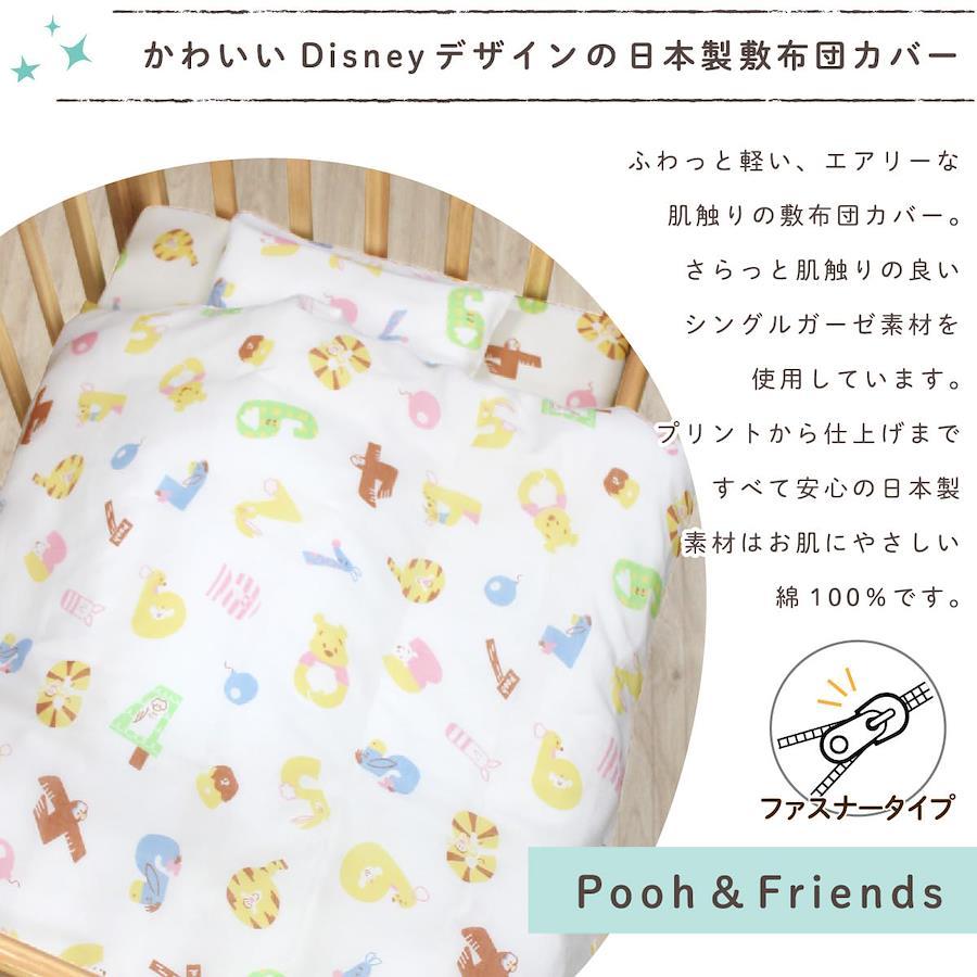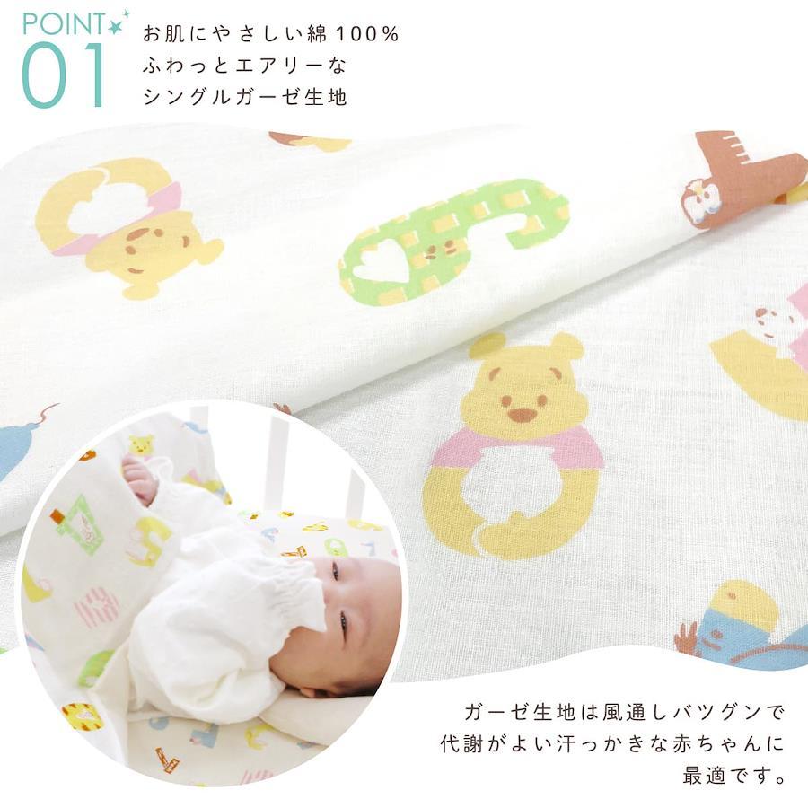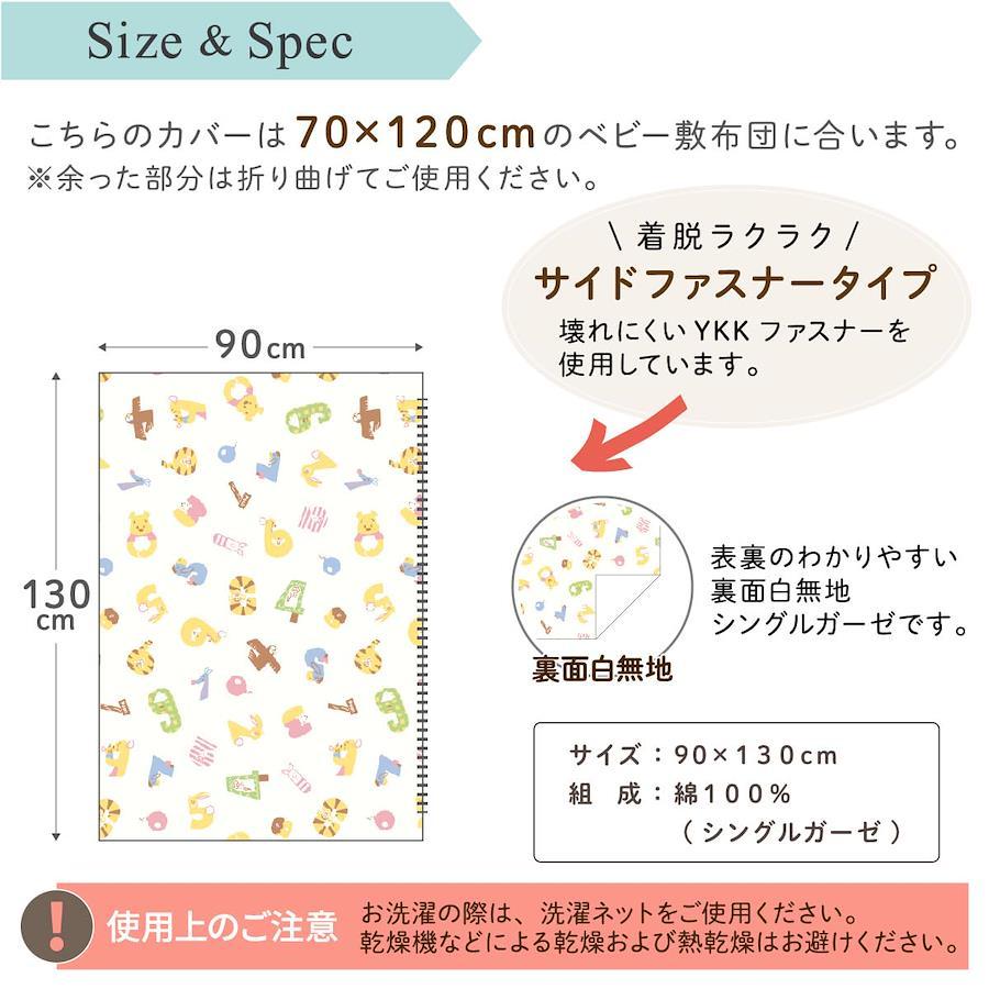 【サイズ】90×130cm ※70×120cmまでのベビー敷布団に使用可能 【組成】綿100% (ガーゼ素材) 【シングルガーゼ】やさしいガーゼ素材なので、敏感な赤ちゃんのお肌にぴったり。薄手のシングルガーゼなのでとっても軽く、エアリーな肌触りです。お洗濯後の乾きが早く、忙しいママにも嬉しいポイント♪ 【YKKファスナー】ファスナータイプなので敷布団中芯の出し入れがスムーズ。 【こだわりのディズニーデザイン】プーさんと仲間たちが数字になっちゃった!どれが誰だかわかるかな?カジュアルな色使いで男の子にも女の子にもぴったりです。 ≪ディズニーベビー≫ (C)Disney. Based on the "Winnie the Pooh" works by A.A.Milne and E.H.Shepard.