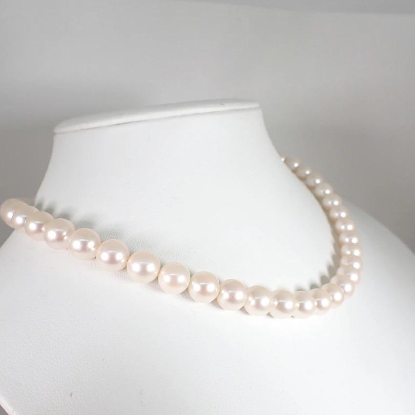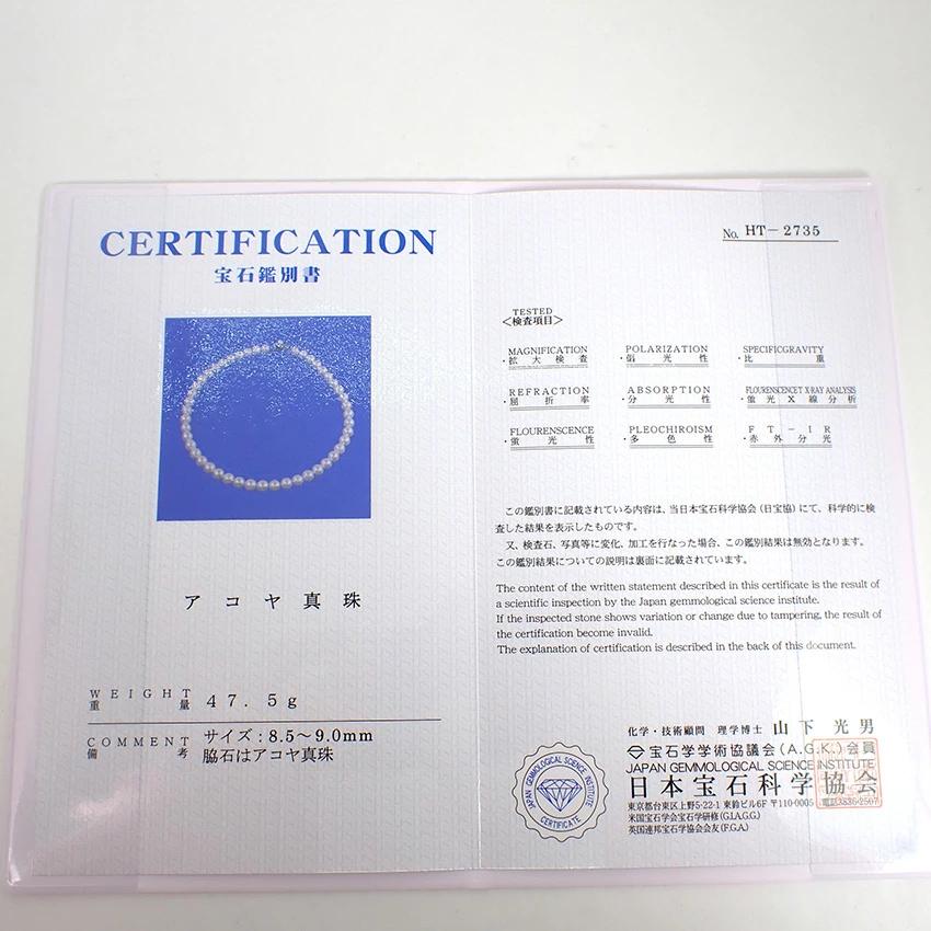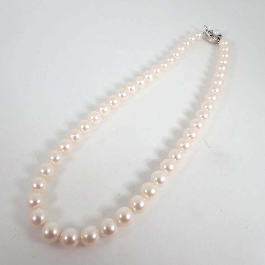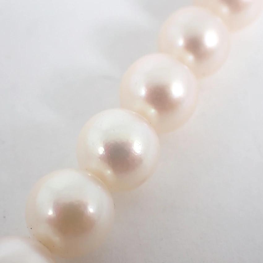 Product DetailsProduct Rank: AMaterial: SilverAkoya Pearl: 8.5mm-9.0mmWeight: Approximately 47.5gTotal Length: Approximately 47cmIncludes a certificate of authenticity from the Japan Gemological AssociationProduct DetailsThis is a standard Akoya pearl necklace with a beautiful white luster.Slight acne and blemishes.Product Rank: [N] New or equivalent, in excellent condition with no defects. [S] Almost flawless and in good condition. [A] Lightly used. [B] Signs of use. [C] Very heavily used, with obvious stains or damage, in need of repair. ____________________________Condition: Used