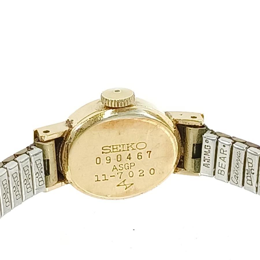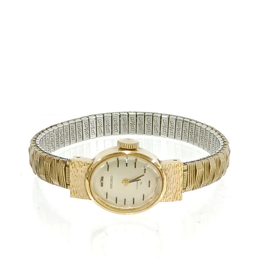 Introducing a classic timepiece, a vintage Seiko women's watch from September 1970. This manual-wind watch features an elegant gold-plated case and a textured, stretch-style band. 💫 Its timeless design and mechanical charm make it a unique addition to any collection.