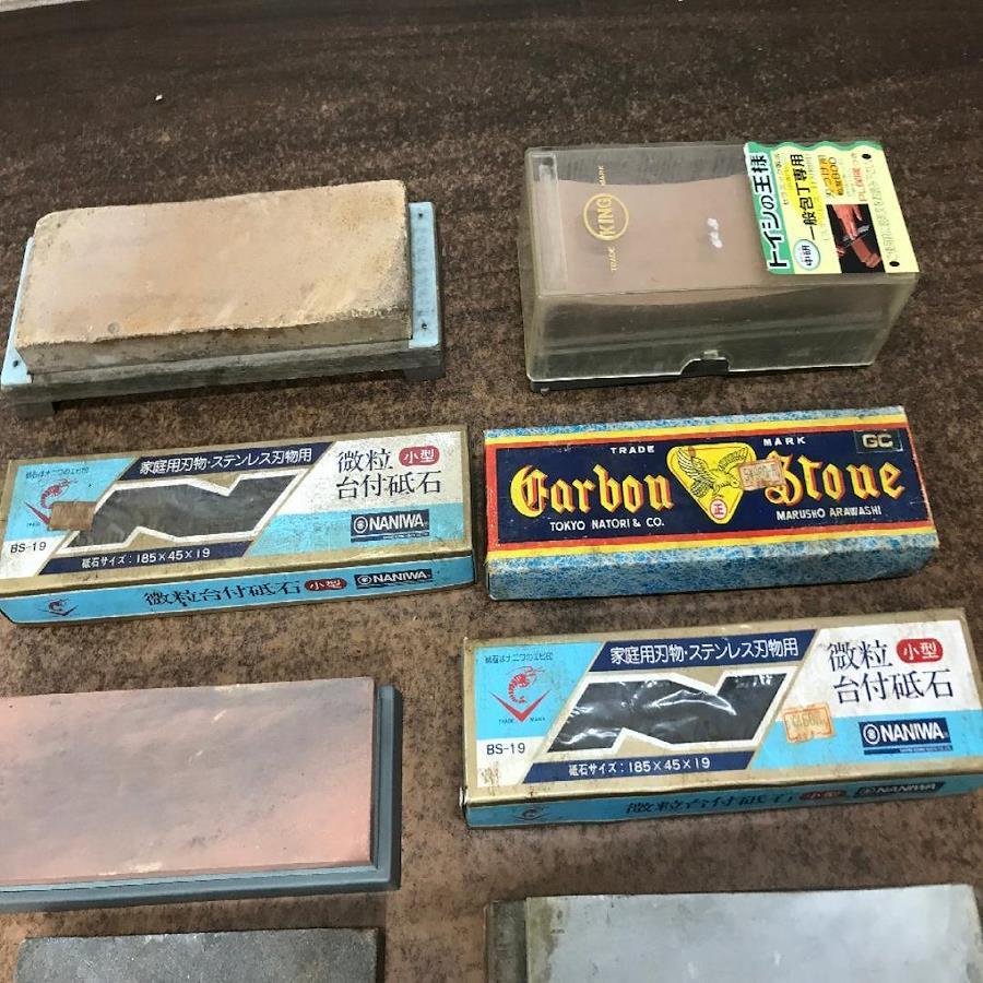 This listing is for a bundle (lot) of used Japanese sharpening stones (Whetstones). This collection includes various types of stones, some with wooden bases, suitable for general knife sharpening, honing blades, and grinding various tools.