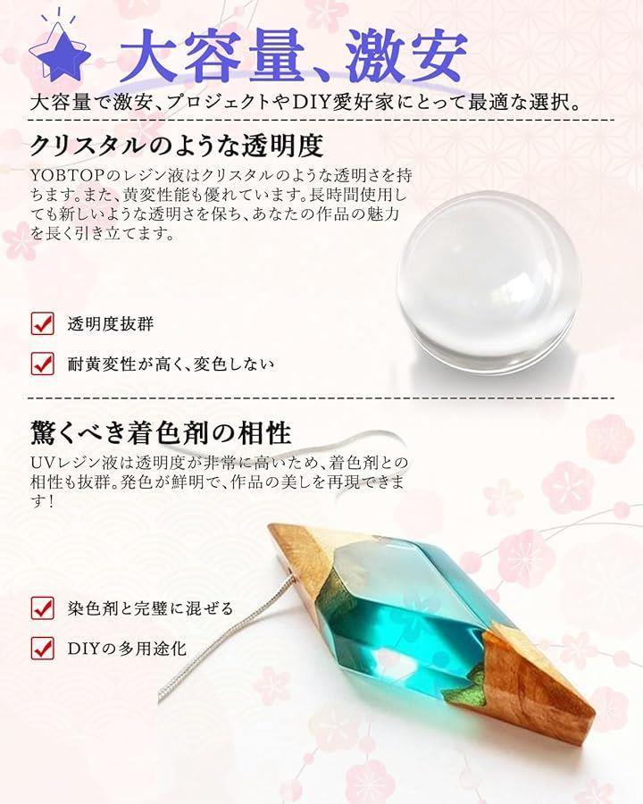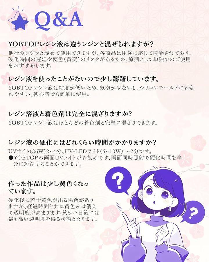 「高品質原料 & 低刺激性」YOBTOPは長年の樹脂生産の経験を持っており、レジンは環境に優しい原料を使用しております、無毒でVOCを含まず、低刺激性で作業中の不快感を大幅軽減。