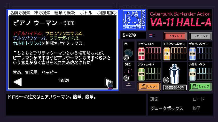 207x年、バー『VA-11 Hall-A』へようこそ。一日を変え、一生を変えるカクテルを!国内外で20万本以上のダウンロードを記録し高い評価を得た、ベネズエラの2人組Sukeban Gamesが作り上げた「サイバーパンクバーテンダーアドベンチャー」ゲーム。「存在すべきでない街」、207x年のグリッチシティの一角にあるバー、『VA-11 Hall-A』。あなたは主人公のバーテンダー、ジルとなり訪れた客にカクテルを作って提供します。客のオーダー通りに作ることも、全く違うカクテルを出すことも可能。提供したカクテルによって物語が変化するサイバーパンクアドベンチャーゲームです。PC版で高く評価された音楽、個性豊かなキャラクターの作りこまれたグラフィック、美しい日本語訳で展開される秀逸なストーリー、「バーテンダーがカクテルを提供することで展開する物語」というオリジナリティ溢れるゲーム性が一体となった、インディーゲームならではのほかに類を見ない秀逸な作品です。