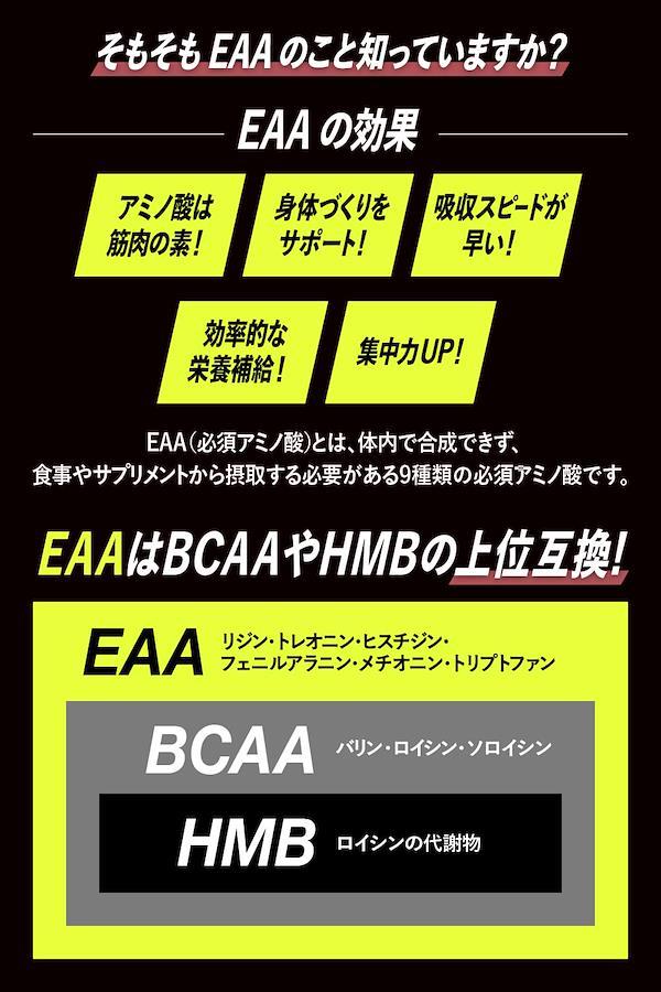 ?【カラダ作りのプロ監修 配合比率にこだわったEAA】体内では作り出すことができない9種類の必須アミノ酸にβアラニンを加えたEAAパウダー。配合比が固定されてしまうオールインワンタイプではなく、カラダ作りに最低限必要なアミノ酸9種以外はご自身のカラダに合わせて必要量を摂取してほしい願いを込めて、「あえて余計な成分を入れない」メジャーリーガー多数指導のトレーナー界のレジェンド山本義徳完全監修のEAAです。 ?【バルクアップサポート成分 β-アラニンとは?】継続的な運動パフォーマンスのサポートをする「カルノシン」の元になる、トレーニングに役立つ非必須アミノ酸であるβアラニンを3000㎎/食配合! ?【運動時にぴったりの飲みやすさ!スポーツドリンク風味】アミノ酸独自の苦みを最小限に抑え、スポーツドリンク感覚で飲める味にこだわりました。フレーバーは全部で6種類(シトラス、パイナップル、コーラ、青りんご、ライチ、スポーツドリンク)!毎日美味しく飲み続けていただくために味へのこだわりを追求し、2023年8月リニューアル時のアンケートで98.54%が美味しいと回答! ?【黄金律で配合した成分(1食(25g))】ロイシン5500mg、イソロイシン1500mg、バリン2000mg、トレオニン1000mg、リシン2500mg、メチオニン500mg、ヒスチジン500mg、フェニルアラニン1000mg、トリプトファン150mg (栄養成分表示):エネルギー 96.50kcal たんぱく質 17.85g 脂質 0g 炭水化物 6.30g 食塩相当量 0.006g ?【飲み方】付属のスプーン2杯(約25g)程度を700?1000mlの冷たい水などに溶かしてお召し上がりください。トレーニング中のドリンクとしておすすめです!※運動時のコンディション維持に役立つと今話題の非必須アミノ酸 ベータアラニン配合。「アラニンフラッシュ」と呼ばれる全身の”ピリピリ感”でパワーを体感することができます。健康上の問題はなく時間の経過とともに治まります。ピリピリ感が気になる方は、少量ずつ時間を置いてお飲みいただくことをおすすめします。