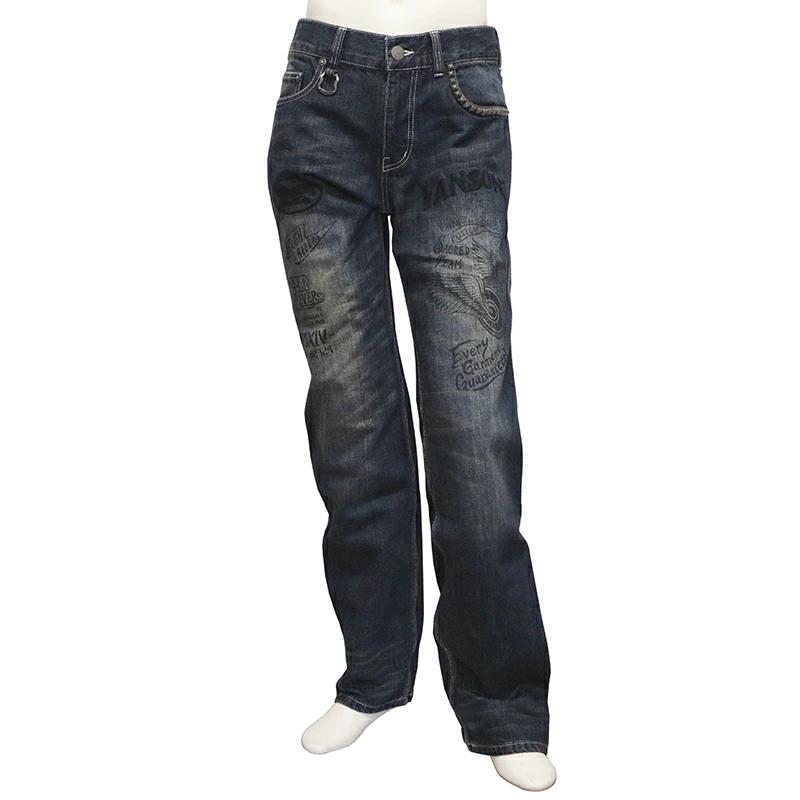 フロントは、右左ふとももにとプリントでVANSONロゴやバイカーらしいデザインをプリントで配置。