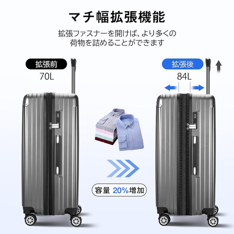 【20%容量拡張&高品質コーナーパッド】スーツケースの拡張機能を利用すれば、マチ幅が5cmほど拡張し、約20%内容量を増加。ABS樹脂とPC混合素材のボディーはただのABS素材より軽量で耐圧性、耐久性に優れています。コーナーパッド付きで、耐衝撃性も抜群です。 【YKK製ファスナー&TSAダイヤル式ロック】スーツケースのファスナーは【YKK】製ファスナーを採用し、滑やかな動きと抜群の耐久性を発揮。(製品に【YKK】制のタグが付いています。)TSAダイヤル式ロック付きでより安全、安心してご利用いただけます。※鍵穴が航空会社の検査専用の物で本製品は鍵が付属しておりません。 【静音キャスター&調節可能なキャリーバー】キャリーケースは三段階調節なアルミ合金制キャリーバーを採用し、スムーズに伸縮可能。TPE素材で作られた静音キャスターが走行中の振動を軽減し、高耐摩耗性、静音性を実現しながら、360°自由に回転可能。後ろの2個のキャスターにストッパー付き、傾斜のある地面でも簡単にキャスターの動きを止められ、移動中のストレスを軽減。 【合理的な内装&乾湿分離ポケット】合理的な内装デザインで乾湿分離ポケットも追加され、濡れものの収納に大変便利。メッシュポケット付きで小物などのお荷物が分かりやすく、一目瞭然。U型仕切り、クロスベルトまで完備され、荷物崩れを完全防止。 【スーツケースベルト付き&永久保証】付属したスーツケースベルトはいざという時にスーツケースをしっかり固定でき、より安心。本製品に永久保証をご提供いたします。永久保証の詳細は取扱説明書をご参考ください。お届けしたキャリーバッグに初期不良または使用中に何が問題がある場合は弊社にご連絡くださいませ。誠心誠意対応させていただきます。