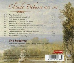 DeBussy: Violin Sonata, Cello Sonata, Piano Trio / Trio Stradivari / Composer: Claude DeBussy / Performer: Federico Guglielmo violin, Jolanda Violante piano, Luigi Puxeddu cello / Orchestra/Ensemble: Trio Stradivari / Number of Discs: 1 / Length: 1 Hours 16 Mins. These original works and arrangements for violin, cello and piano by Claude DeBussy span the composer's protean career, from the early Piano Trio of 1880 to the Cello Sonata of 1915 and the Violin Sonata, completed in 1917 as part of an abortive six-sonata project which ended halfway when he died the following year. Especially since the performances are given with the experience harvested by three musicians who are better known as early-music specialists, soaked in the philosophy of historically informed performance practice, they offer an intriguing survey, unique on record, of the composer's development. As Harold Schonberg, music critic of The New York Times, wrote, it would be amusing to invite classical music 'experts' to listen to the Piano Trio, with it's expressive reminiscences of Schumann, and then guess who the composer is: few of them would say DeBussy. And yet the two late sonatas masterfully shuffle the cards of Impressionism, pre-Classical sonata structures and Stravinskian distance and eccentricity: the Cello Sonata originally bore a heavily symbolic title (Pierrot fach? avec la lune) relating to the paintings of Watteau with their elusive mixture of melancholy and irony. It uses the timbre of early music and citations from the great French harpsichordists to conjure up Pierrot's moody, troubled world, which was that of the slyly smiling masks of the commedia dell'arte. The arrangements are the work of several hands, among them DeBussy himself, of better-known and justifiably popular works that revel in the sophisticated evocation of mood through lyrical melody and evanescent textures, including 'The Girl with the Flaxen Hair' and 'Minstrels'. Recorded in 2013. The works on this CD stem from the early and from the late period of DeBussy's creative life, and are for these reasons not "typical DeBussy", in the sense that they eschew the "impressionistic" features so often associated with the composer. The piano trio is a sumptuously romantic work, with echoes of Schumann and Franck, whereas the cello sonata and violin sonata are part of the "6 sonata" project which DeBussy started in 1915, but didn't complete because of his untimely death in 1918 (only 3 sonatas were composed). The music is transparent, with neo-classical hints, and sometimes with Stravinskian bite and humor. The musicians on this CD, Federico Guglielmo, Luigi Puxeddu and Jolanda Violante have won their spurs mainly in Early Music; therefore their view on these works is fresh and open, with infectious esprit and zest. As bonus a series of short and much loved pieces in arrangements: Reverie, Arabesque, Minstrels, La fille aux cheveux de lin, and two early original miniatures for cello and piano. 'I think they are among the best music groups I have heard in a long time.' (Isaac Stern on Trio Stradivari)