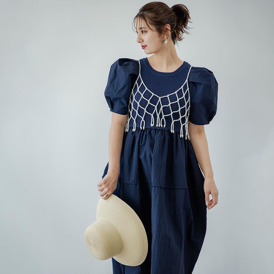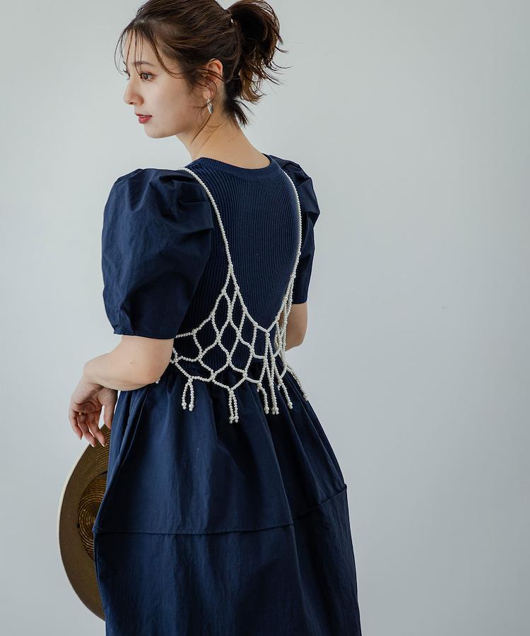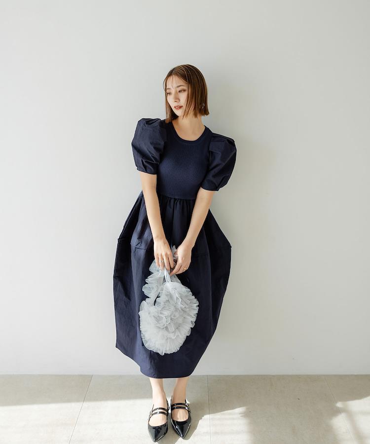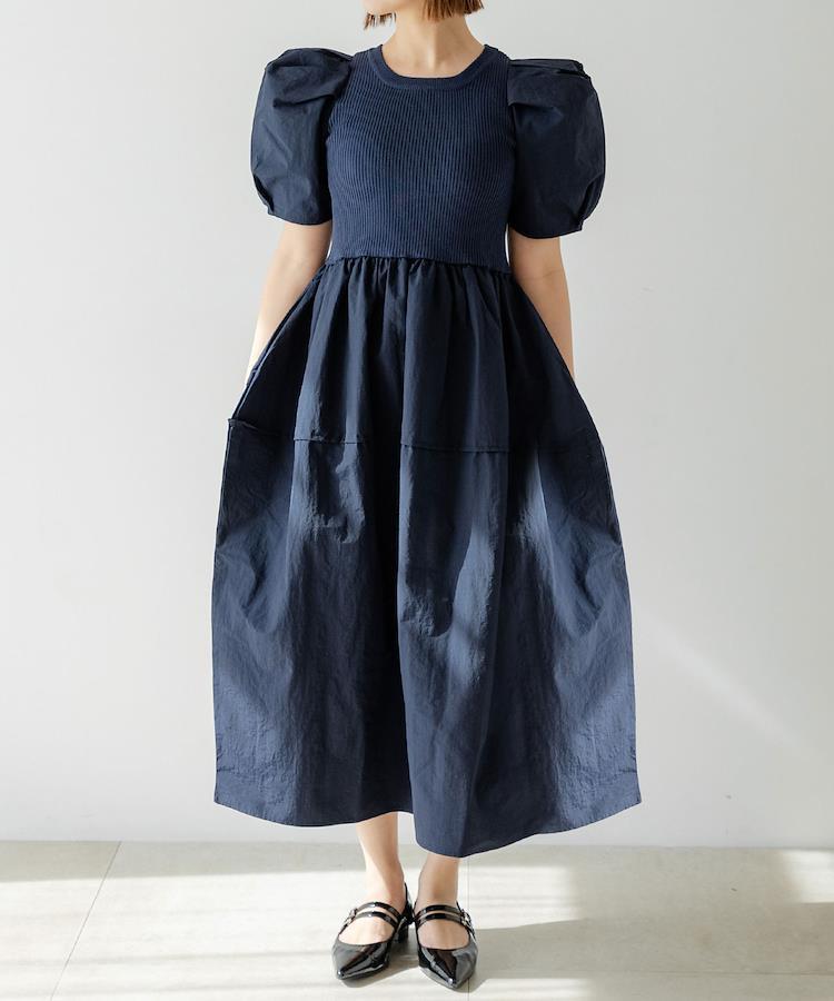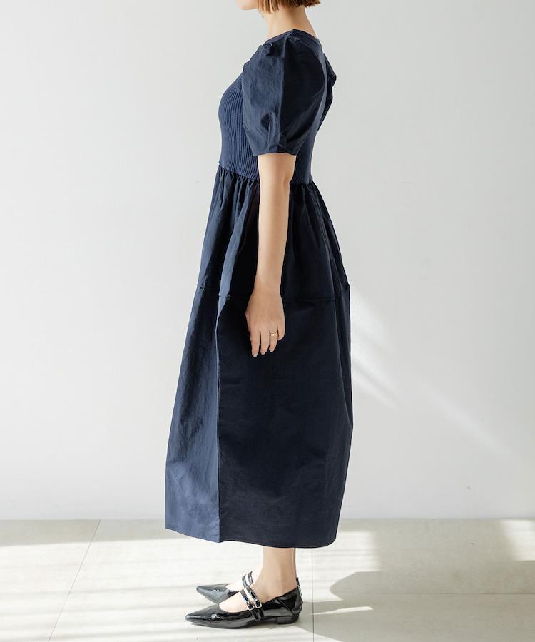 さらりとした着心地の良いリブ編みニットに異素材をドッキングさせたワンピース。