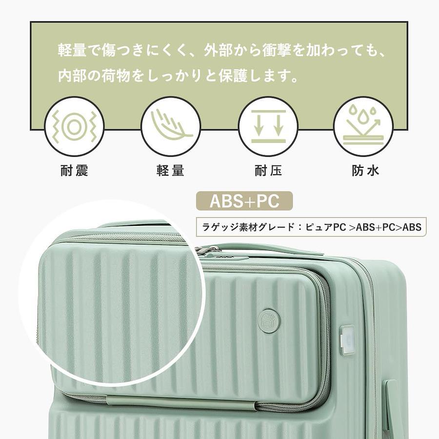【表地 機内持ち込み可能】トランクはABS樹脂とPC製での混合素材を採用します。高弾性で、変形しにくい、防水性、耐衝撃性を備えています。また、軽量で女性でも持ち上げられますが、衝撃を強く受けても中の荷物をしっかりと守ります。Sサイズ(外寸:53.5*40*22.5、内寸:46.5*36.5*22.10):一部の航空会社だけに適用しますので、事前に航空会社に確認したほうがいいんです。 【360度回転 静音耐衝撃】キャリーケース(行李箱)は高弾性で衝撃軽減素材のキャスターを採用します、360度自由回転し、スムーズな滑りを実現できます。多段階キャリーバーで、ご自分の身長に合わせてスムーズに調整できます。様々なビジネスシーンに余裕に対応します。コーナーパッドを装備し、衝撃を受けやすい角をガードできます。おしゃれでおすすめです。 【フロントオープンカバーデザイン】フロントオープンのデザインで、iPadまたはメガネケース、ペットボトルなどのたくさんの小型の物が収納できます。また,出張や資料の持ち運びなどビジネス用途から旅行まで、色々な場面で活躍できます。人気が高い前開きのキャリーケースです。 【ロック付き USBポート付き】ダイヤル式ロックを採用し、鍵の持ち歩きが不要なので、紛失の心配がないです。暗証番号(自由に設定可能)により、確実にロックされます。外出がより安全になります。また、USBポートを付き、スーツケースを開けることなくスマホを充電できます。外にいても仕事の邪魔にならない、海外旅行も出張も安心です。 【カップホルダー付き】人気で便利な折りたたみ式ドリンクホルダー付きがあります。カップホルダー、ミルクティーカップ、傘などがいつでも配置でき、旅行中の手への負担を軽減し、旅行をより気楽にします。多機能フロントオープンキャリーバックで流行です。