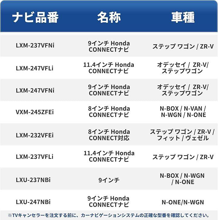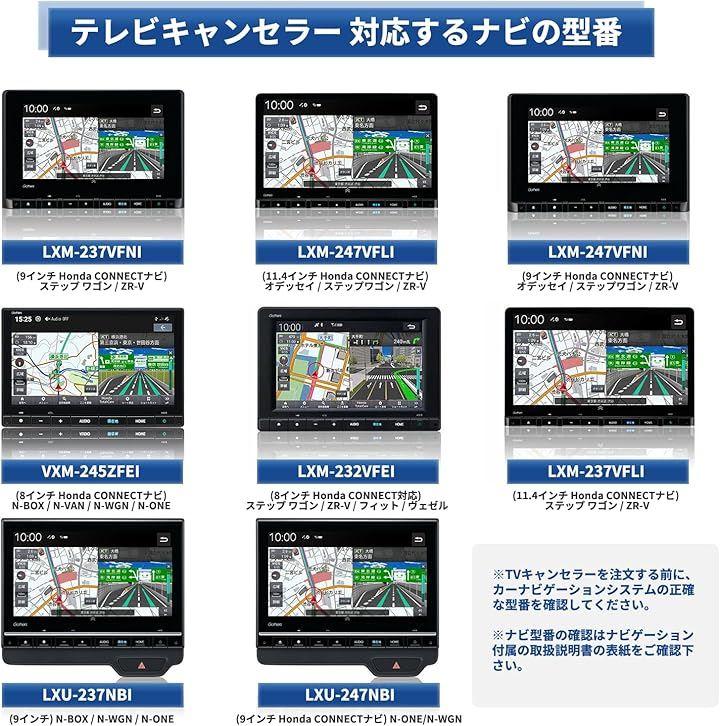 「 テレビキャンセラー 対応するナビの型番」:・LXM-237VFLi (11.4インチ ホンダ CONNECTナビ) ステップ ワゴン / ZR-V ・LXM-237VFNi (9インチ ホンダ CONNECTナビ) ステップ ワゴン / ZR-V ・LXM-232VFEi (8インチ ホンダ CONNECTナビ) ステップ ワゴン / ZR-V / フィット / ヴェゼル ・LXU-237NBi (9インチプレミアムインターナビ) N-BOX / N-WGN / N-ONE。