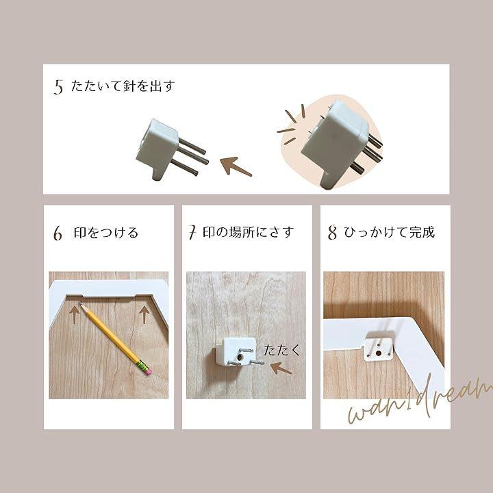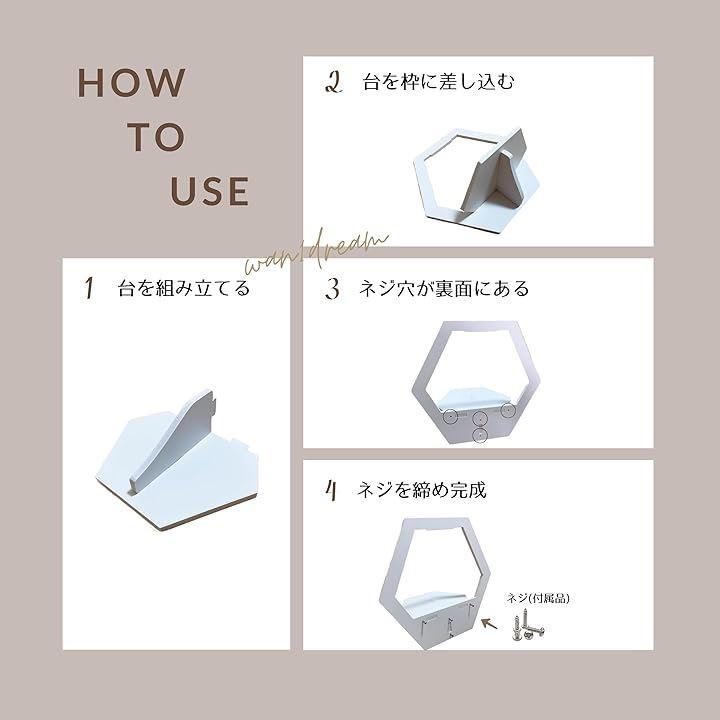 (1)三つの板材をを組み合わせる (2)板材を付属の補強ネジ(4本)で固定する (3)板材を固定ピン(2個)を壁に取り付ける (4)固定ピンに板材をひっかけて完成