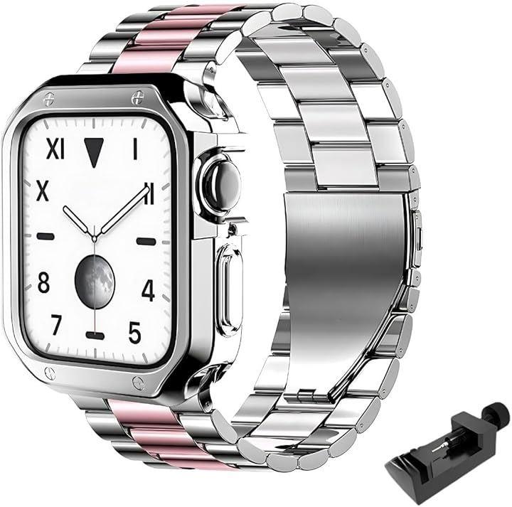 「付属品」本製品には、メタルバンド、メッキ加工が施されたTPU製ケース、リンク取り外しツール、予備ピン、取り付け工具がすべてセットになっており、購入後すぐに使用可能です。