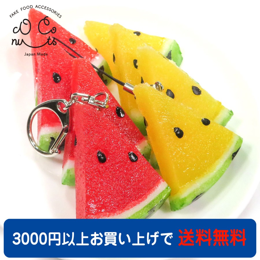 長さ約5cmのミニサイズのカットスイカの食品サンプルアクセサリーです。触ると果汁があふれそうなくらいみずみずしい仕上がりです。赤と黄色の2色があります。