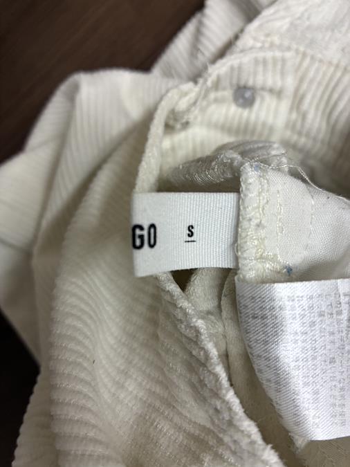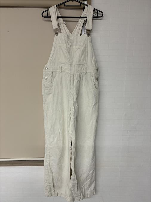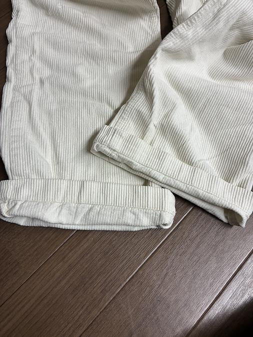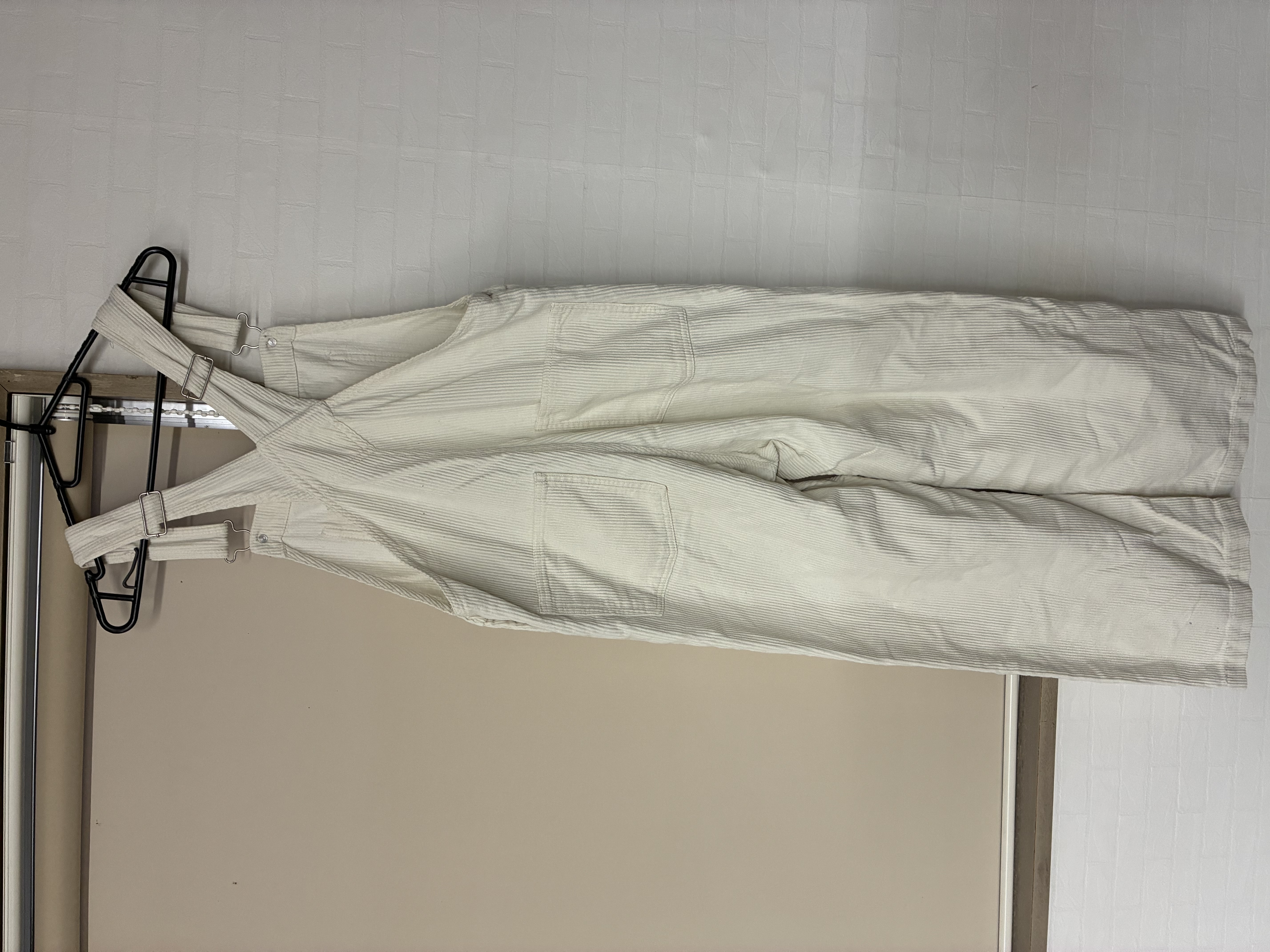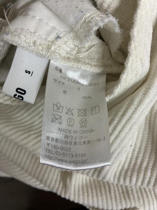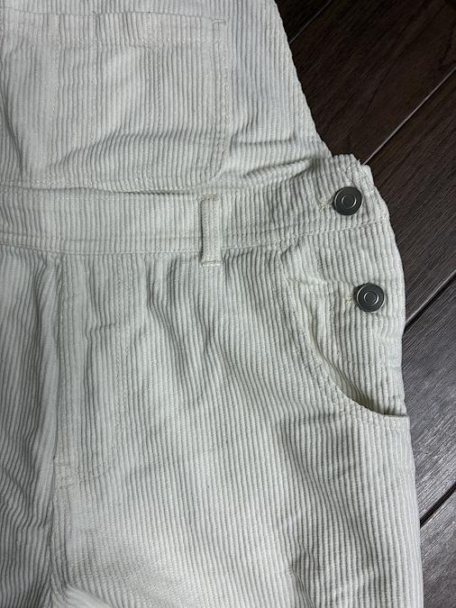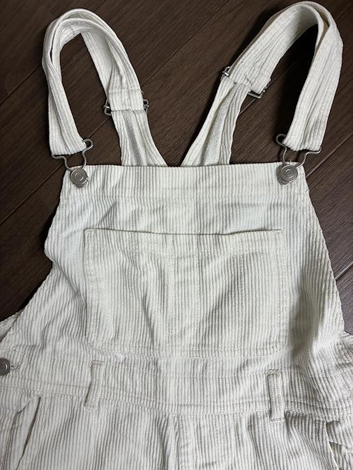 WEGOのコーデュロイサロペット、ホワイトSサイズです。前面にも裏面にも2つのポケット付き。紐の長さは調節できます。裾にも汚れや破れはなかったです。膝辺りに小さな傷のようなものがありました。お写真8枚目でご確認下さい。