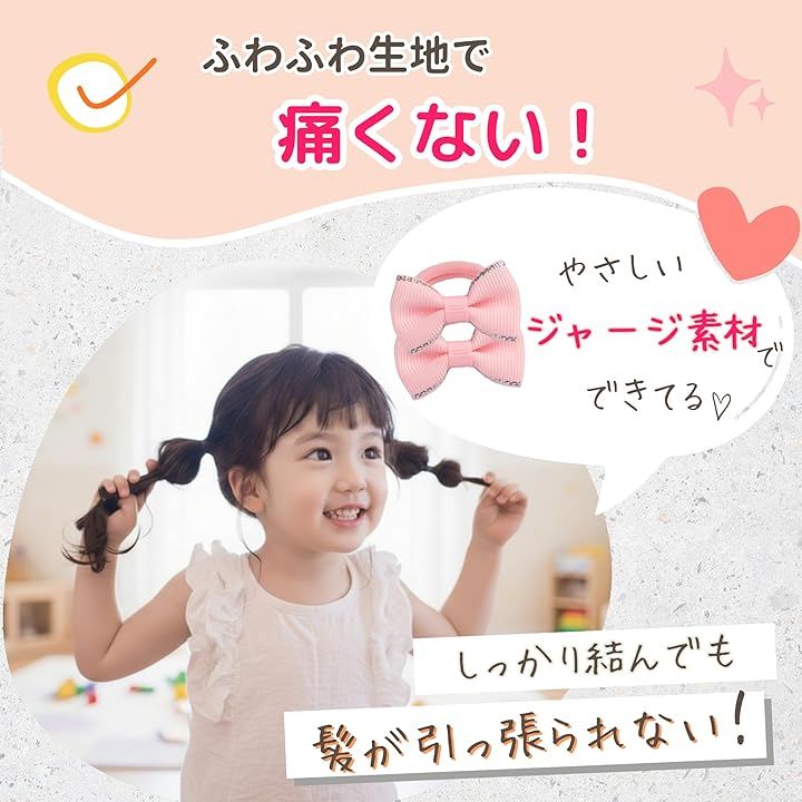 子どもの柔らかい髪に優しく、痛くない髪ゴムなので赤ちゃんにも最適な髪飾りです。