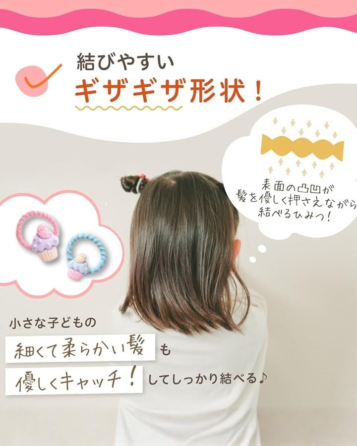 「髪の毛の少ない子供専用ヘアゴム」独自のギザギザで髪が少なくても結びやすい。 ゴムが小さめで伸縮性があり、細く少ない髪でもしっかりホールド。